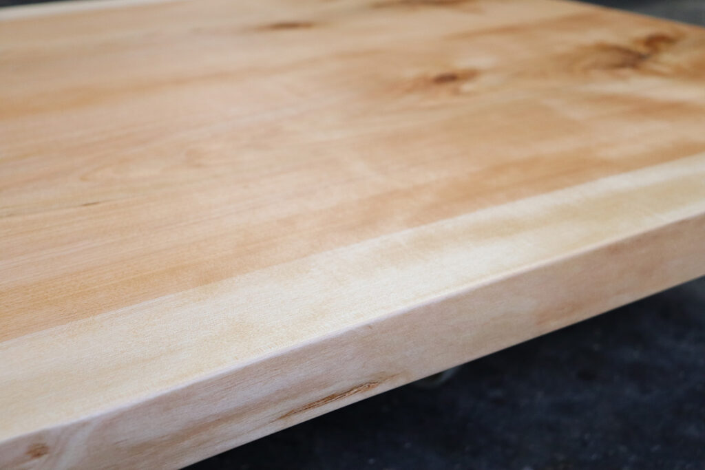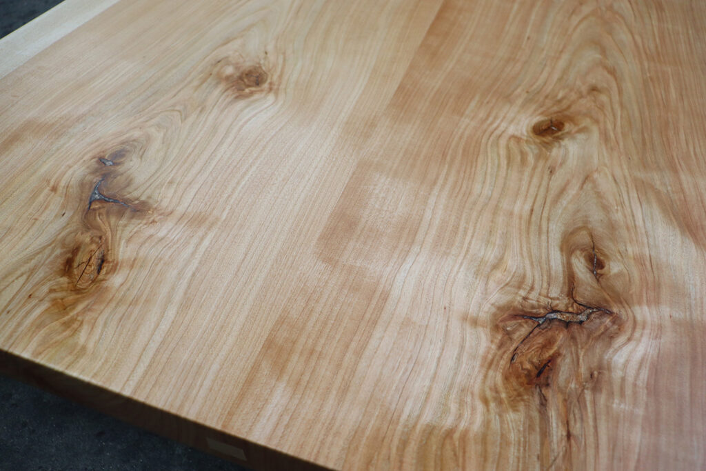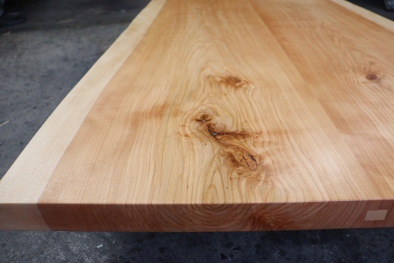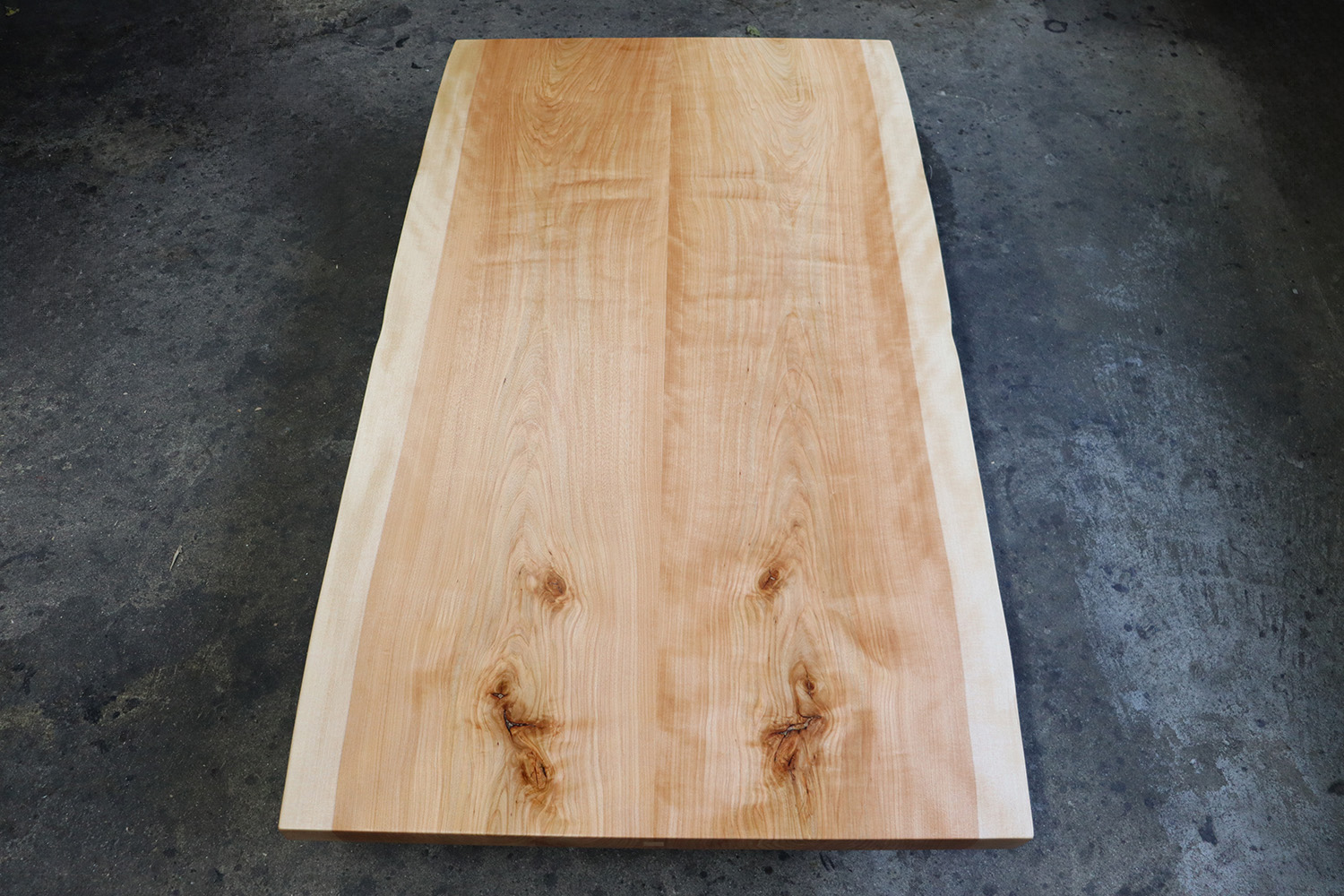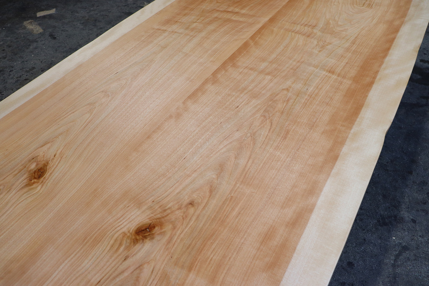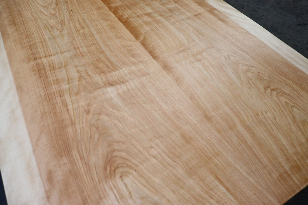 淡く流れる木目に、ところどころ現れる節やゆらぎが、この一枚にしか出せない個性を創り出すカバ桜のブックマッチ天板が仕上がりました。