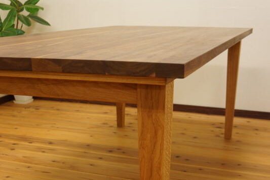 お客さまのご要望に合わせてサイズを選べる、オーダーテーブルです。お部屋に合わせやすい、シンプルなデザインで仕上げています。華奢な印象ですが、安心して長年ご使用いただけます。脚部はノックダウン式ですので六角レンチで脱却が可能になっています。天板トップは[ブラックウォールナット・メープル・オーク]の中からセレクトいただけます。脚部の素材はオーク材で統一しています。