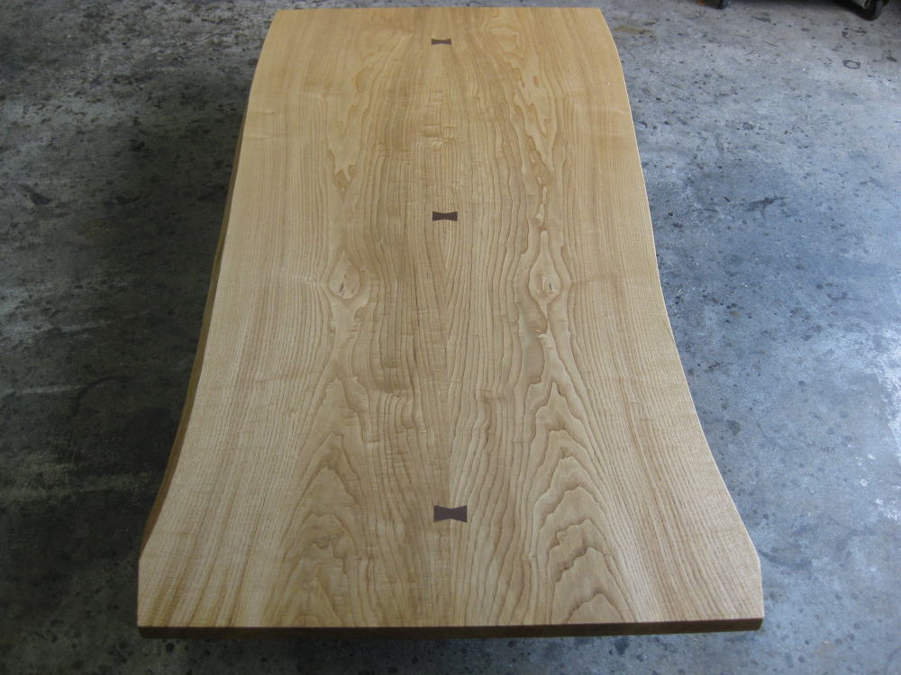 6名様でゆったりご使用になれる1800㎜サイズの栗の木のブックマッチの2枚ハギが仕上がりました。日本人にはとても身近に感じる栗は乾燥も加工も大変難しい樹ですが、耐朽性や保存性も極めて高く、水分や湿気にも強い樹として有名です。栗の木は古くから日本で用材として評価が高く、木材の持つ硬さと木目の明快さ、材質の軽さが一枚板にも最適な材質です。そんな栗の木を二枚ハギのブックマッチをぜひいかがでしょうか!