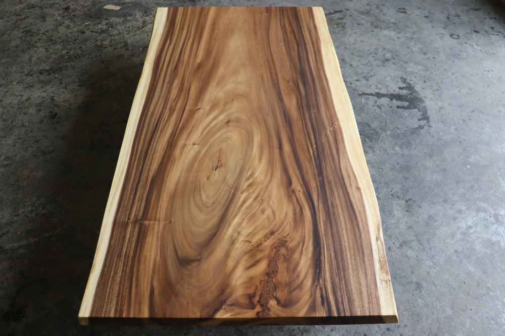 4名様ご使用でゆったり広々とお使いになれるサイズのモンキーポッドの一枚板が仕上がりました!1500㎜サイズの天板は扱いやすく最近需要が高まっております。モンキーポッドという材種にも注目が集まっており、特有の色合いとほかにはない面白味のある木目が人気の理由です。育つ地域によっても木目の違いがはっきり出るところが無垢材の良さでもあります。そんな存在感のある一枚板をぜひダイニングやリビングにいかがでしょうか!