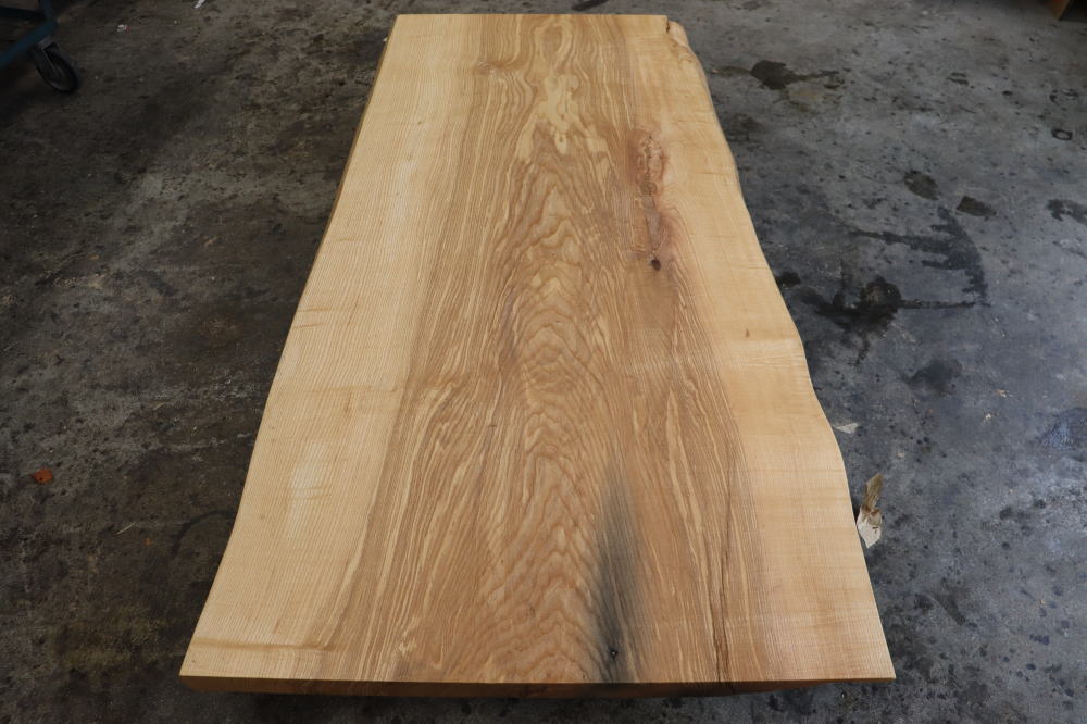 アッシュ材の4~6名様でゆったりご使用になれる1800㎜サイズの一枚板が仕上がりました。「アッシュ」とは外材なのですが、北海道産の「タモ」という木材と同じ分類をされます。粘り気の強い材質のため、耐衝撃性に富んでおり有名なものでは野球バットにも使われております。迫力のある木目を持ったアッシュ材の一枚板をぜひ食卓にいかがでしょうか!