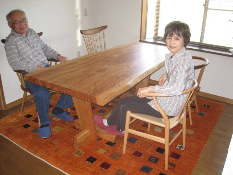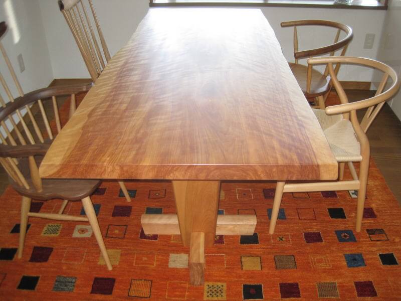 カバ桜の一枚板テーブルの納品に伺いました。ご来店時に一目見て気に入っていただいた桜材、脚部も天板の迫力に負けないデザインで製作しました。しっかり椅子ごと囲えるサイズのギャッベ絨毯も一緒にセレクトしていただきました。