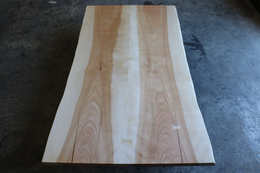 幅も80㎝以上あり食卓には使いやすい寸法に仕上がりました。一枚一枚木目が異なるのですが、こちらの板は赤身のバランスがとても良く、魅入ってしまう美しさを感じてしまいます。カバ桜ならではの色味はどなたが見ても明るく、食卓をすっきりとした空間に見せてくれます。