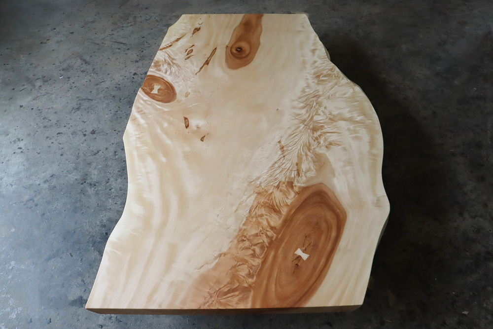 4~6名様でご使用になれるサイズの高級材〔栃〕の一枚板が仕上がりました!天然の一枚板ならではの変形木による、ひと際目立つ存在感がこの板の長所になります。色合いはとても明るくどんなお部屋に置かれても明るく感じる仕上がりです。乾燥の際に生じた割れにはカバ桜で制作したチギリを入れ込んでおります。手触りよく、見た目も光り放つような光沢感の栃の一枚板をぜひいかがでしょうか。