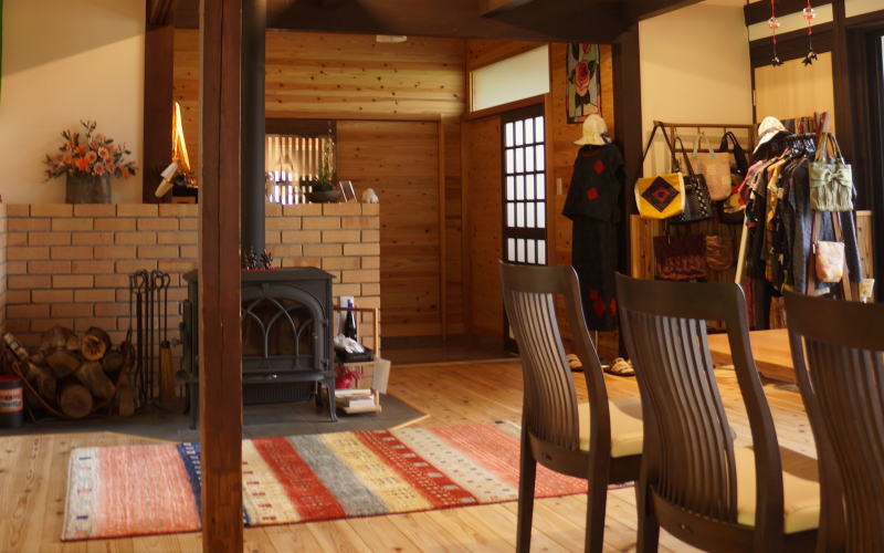 丸亀市富熊に古民家をリフォームした、とってもオシャレなCAFEがあります。当店と同じ名前の写真の「杉村さん」は陶芸が趣味で、建物裏にはのぼり釜まであります。CAFEと併設したスペースで陶芸教室もされています。古民家をリフォームしたCAFE内で当社の手作り家具や、ギャッベをお使い頂いてます。天井を見上げれば、大きな梁が見える落ち着いた和風空間でゆったりできます。