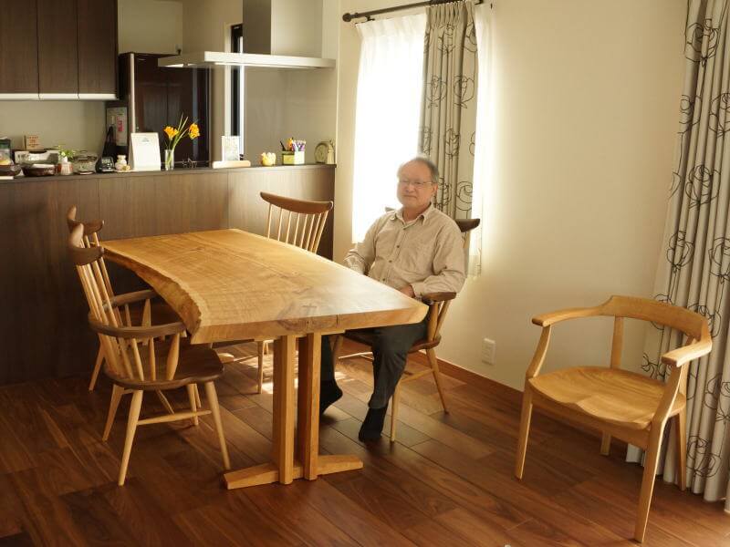 大胆な形をしたオーク材の一枚板テーブルです。ウォールナットのフローリングともいい組み合わせですね。是非また、奥様とご一緒に遊びにいらしてください。