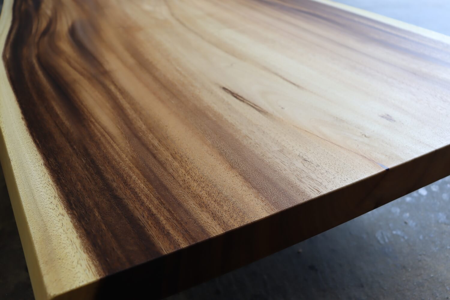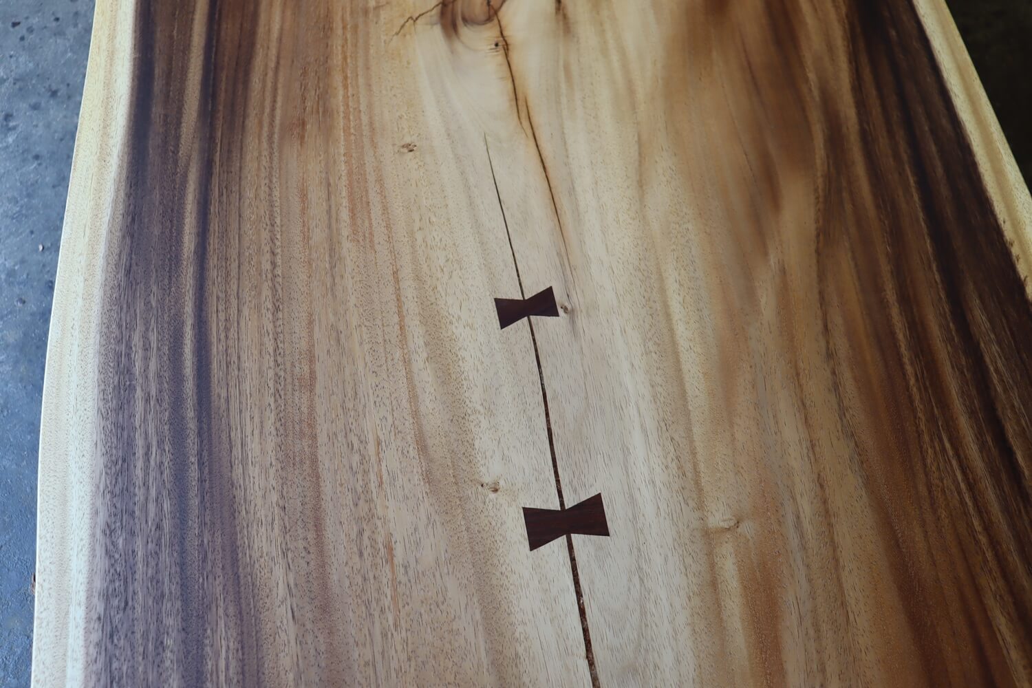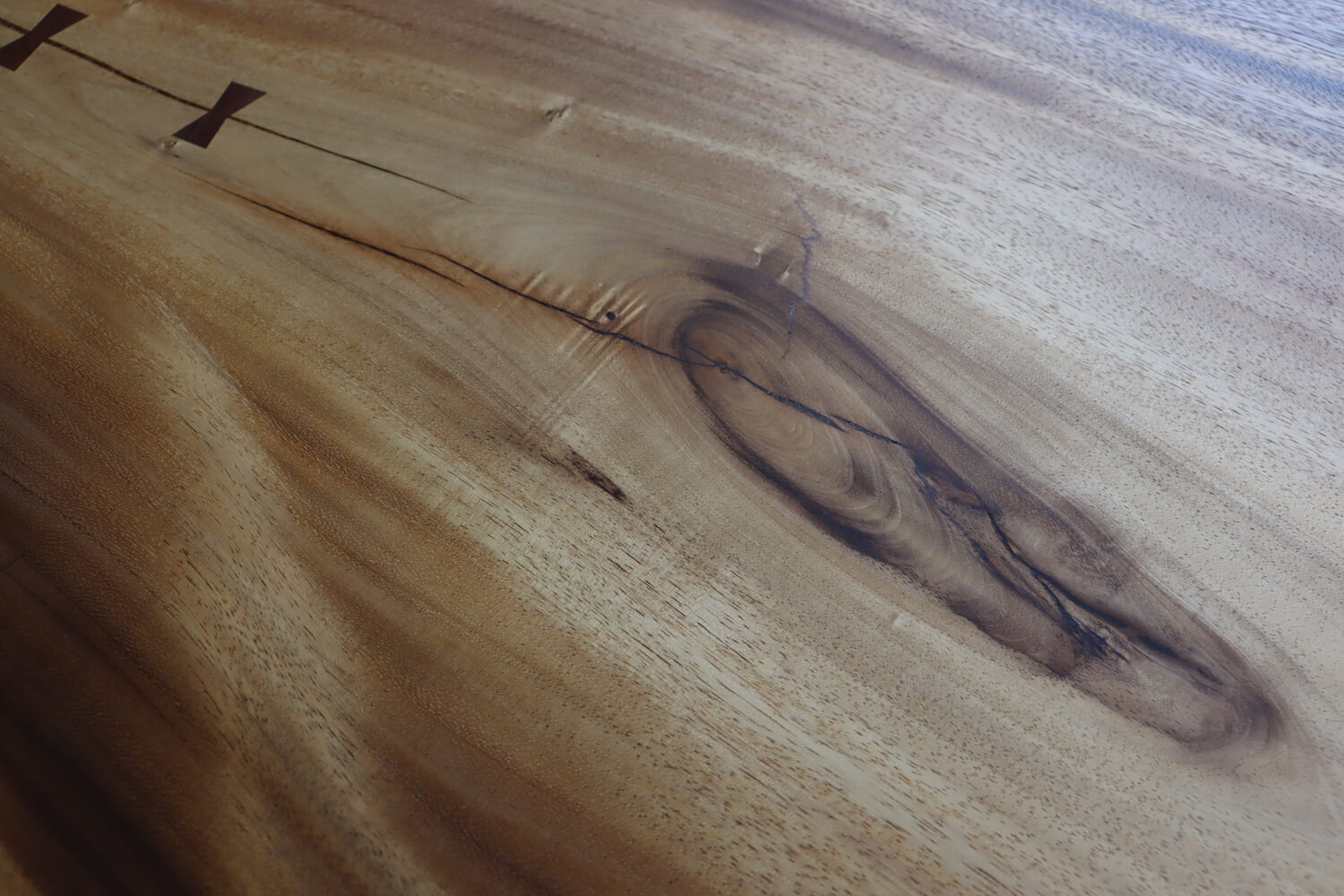 4~6名様でゆったりご使用になれる1800㎜サイズモンキーポッドの一枚板が仕上がりました。熱帯雨林など自生するモンキーポッドは成長スピードが早く、曲がることなくまっすぐに伸びる傾向があります。国産の一枚板には無い独特な見た目にここ数年注目が集まっています。乾燥の際に割れた箇所にはウォールナット材のチギリを入れ込んでおります。