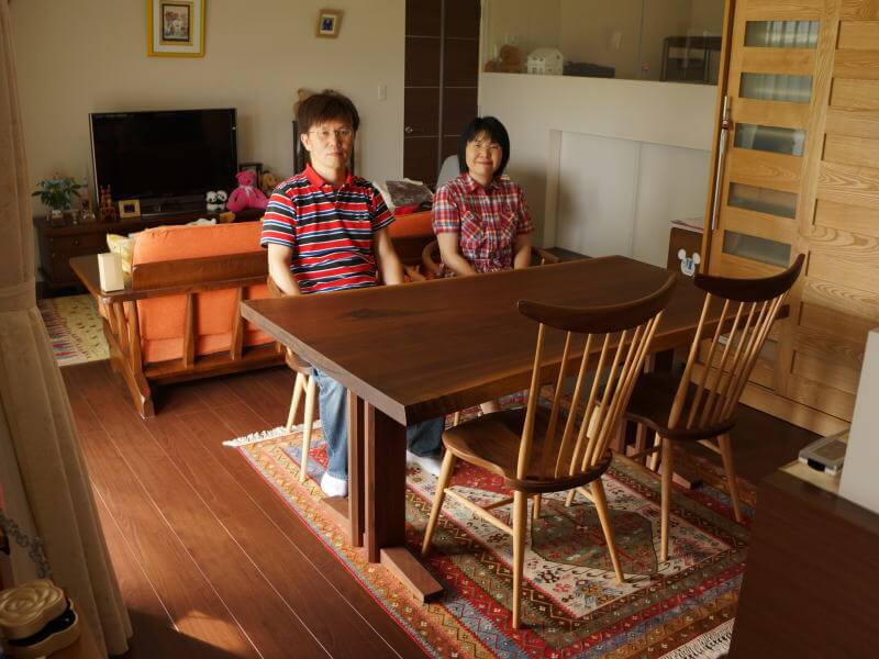 ブラックウォールナットの一枚板、ダイニングテーブルをお届けしました。脚部デザインもこだわり、製作しましたテーブルは良い仕上がりになりました。同じくお届けしました、ウォールナット材のチェアとも相性が良く、綺麗なダイニングセットになりました。当社のギャッベやキリムをご使用いただいています、M様、有難うございます。