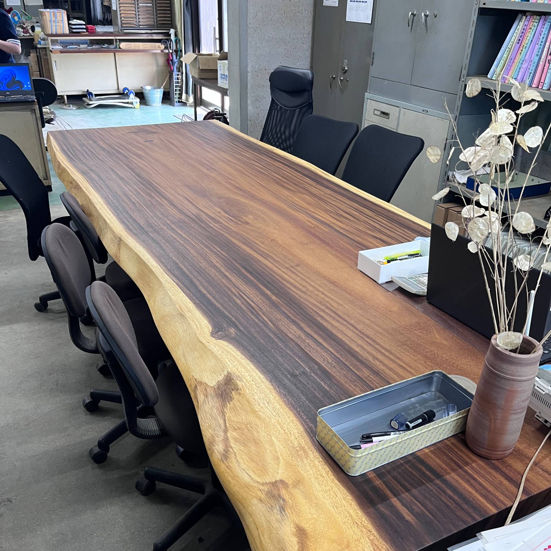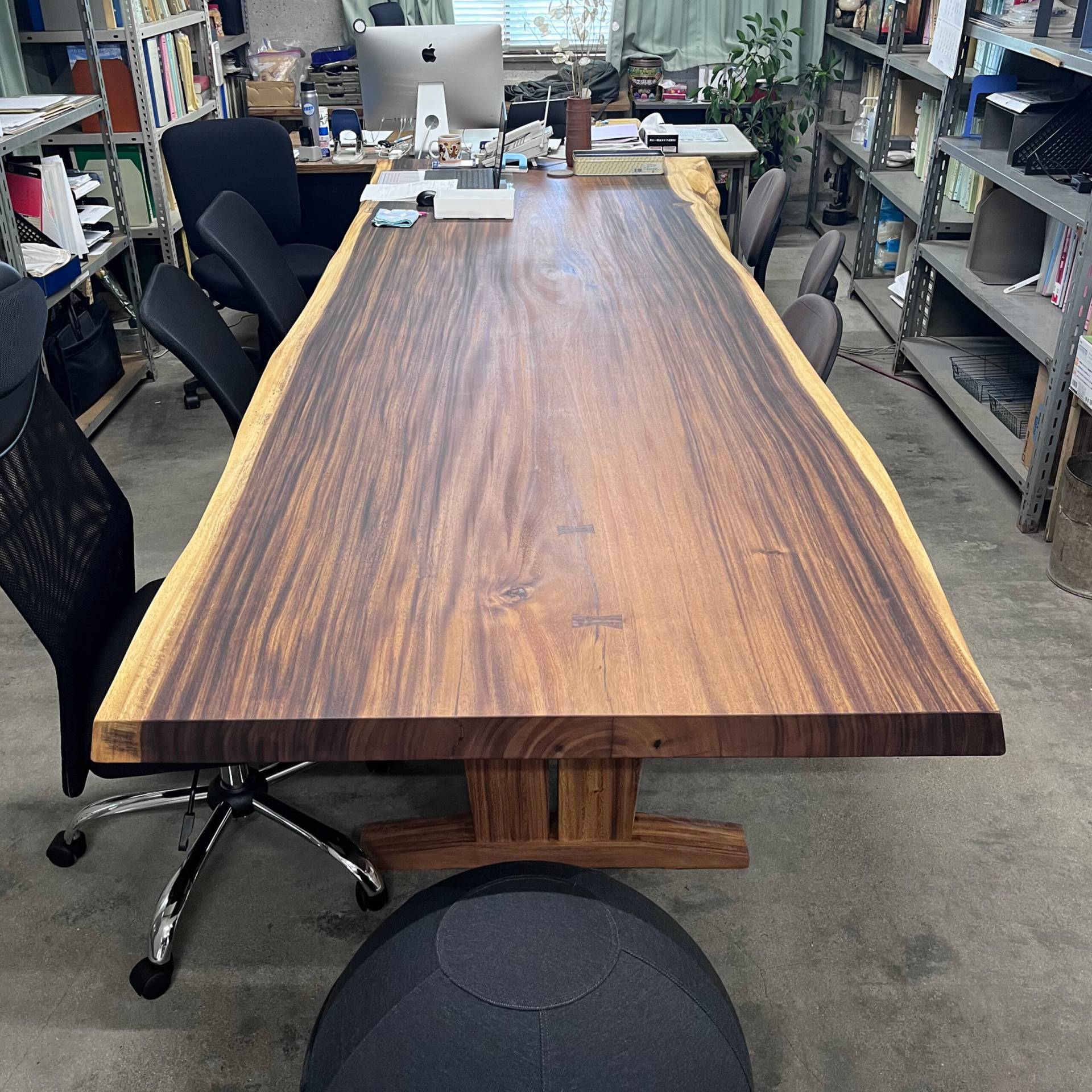 観音寺市藤村鐵工所さまの事務所にモンキーポッドの一枚板を納品させていただきました!