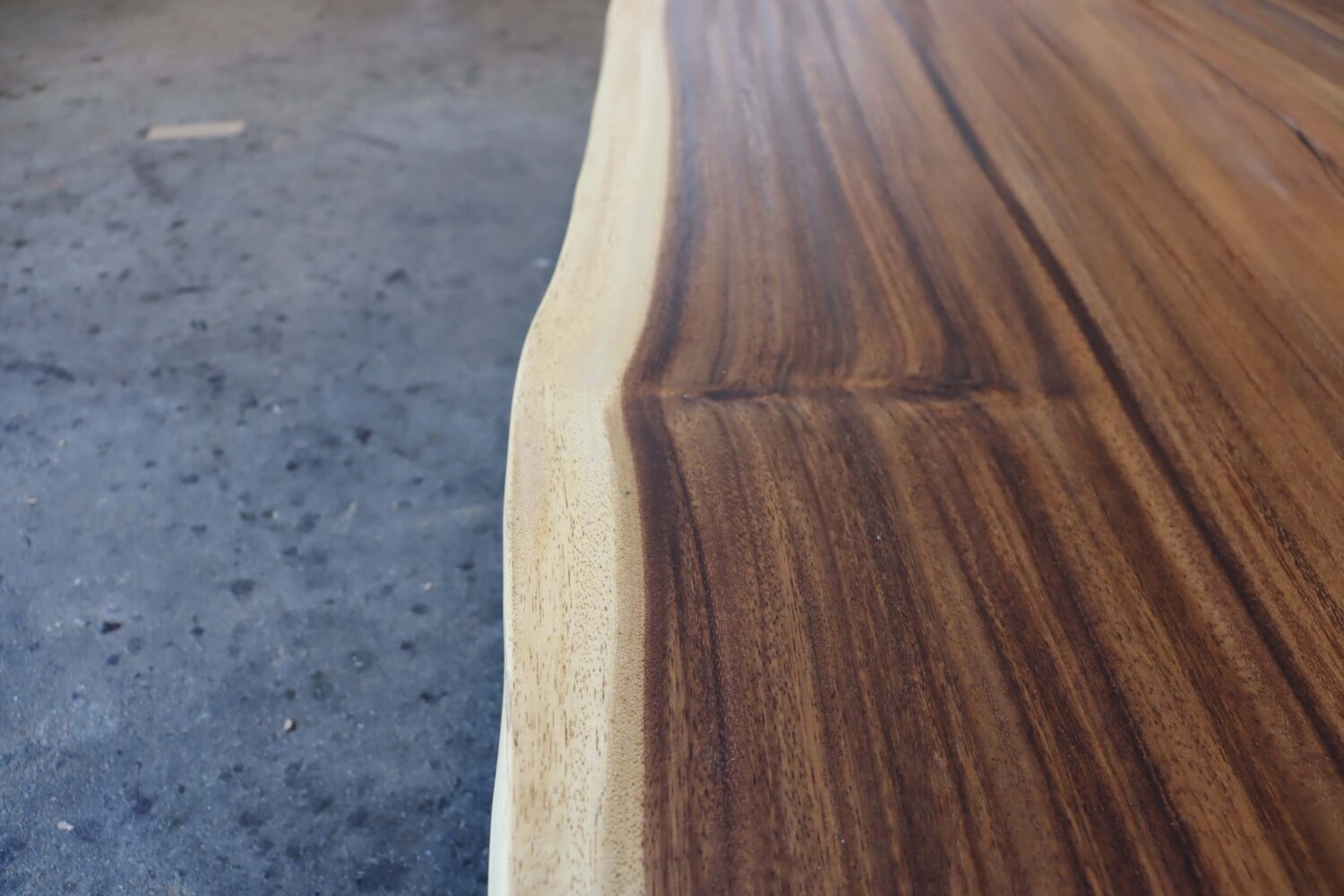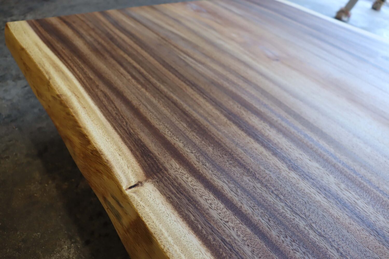 4~6名様がゆったりとご使用になれる1800㎜サイズのモンキーポッドの一枚板が仕上がりました。幅が小さいところで1mもあり重厚感のある一枚板です。国産材では幅の広い板が見つかりにくい中、外材のモンキーポッドではまだまだ存在しております。乾燥の際に割れた箇所には同材の樹の粉と接着剤を混ぜたもので埋めてあります。