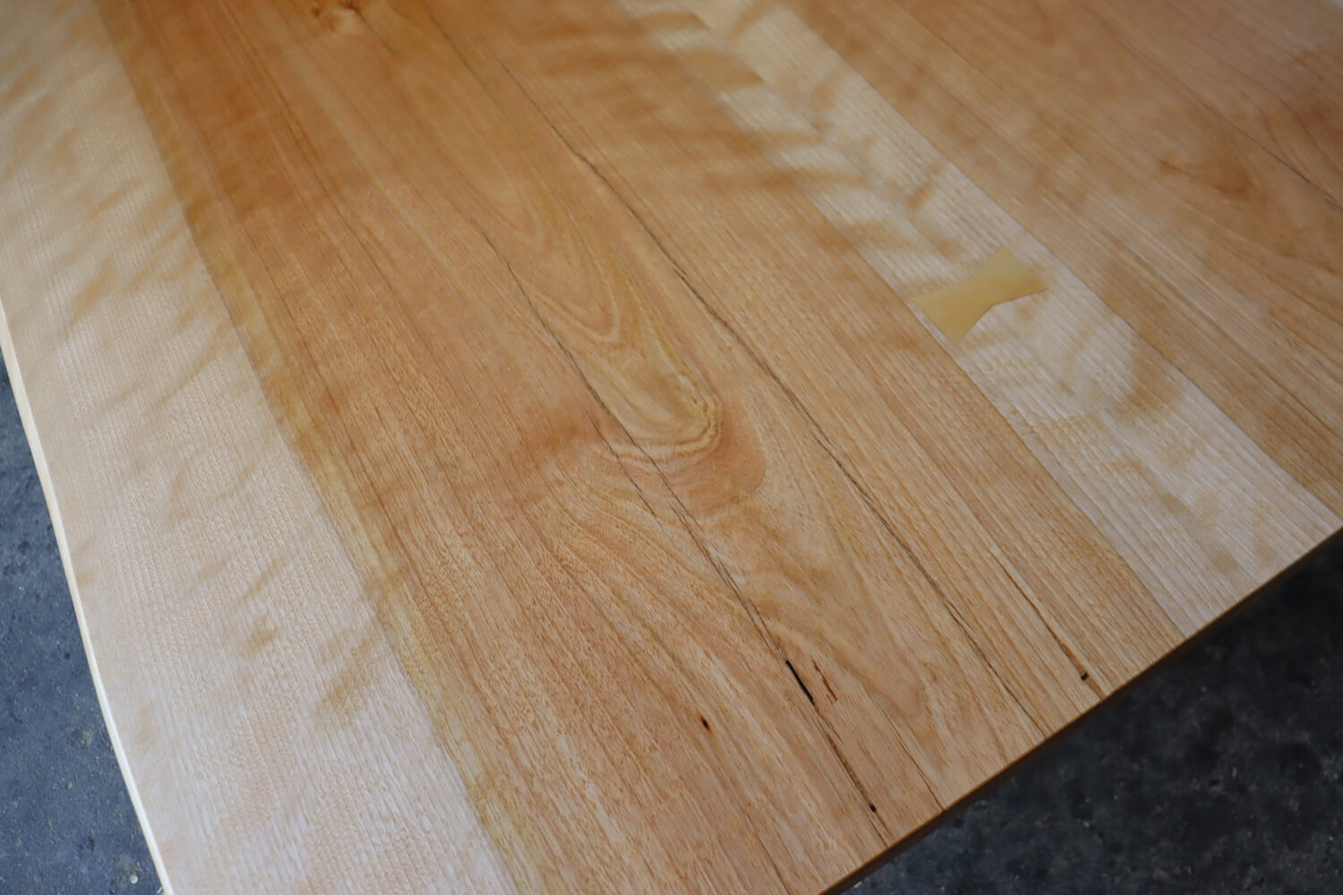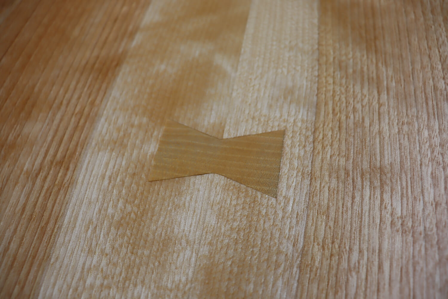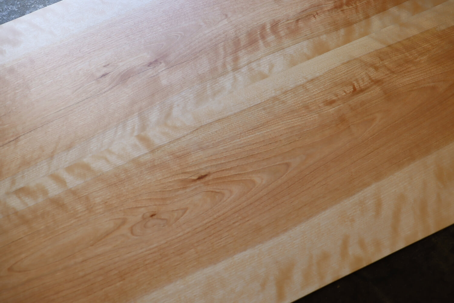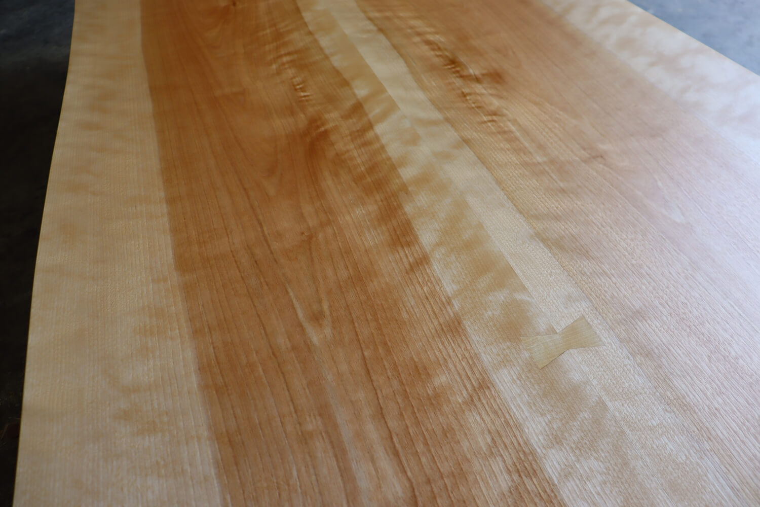 4~6名様でゆったりとご使用になれる1800㎜サイズのブックマッチが仕上がりました。北海道産のカバ桜を使用した非常に硬い材質のブックマッチです。2枚ハギになりますのではぎ合せた箇所には「チギリ」を手作業で入れ込んでおり、手作りならではの仕上がりかつ、丈夫で永くお使いになれるものとなっております。