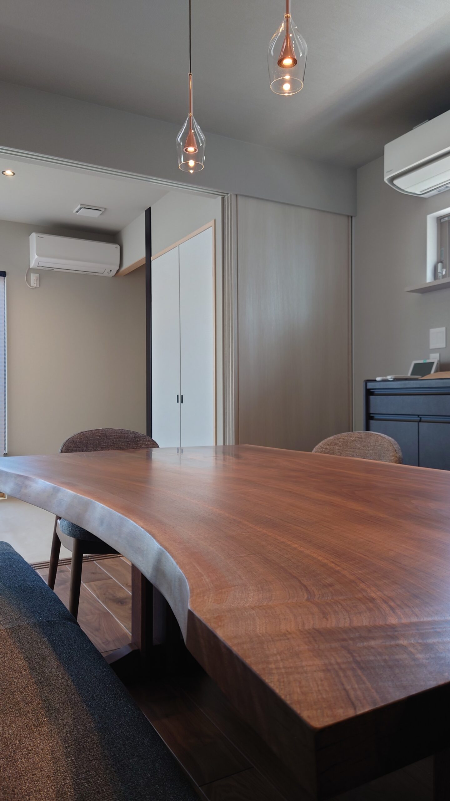 当店に遠くからお越しいただき有難うございました。落ち着いた雰囲気のダイニングにピッタリのウォールナットの一枚板と同材のベンチと椅子3脚を納品させていただきました。フローリング、キッチンの色合いと非常にマッチしていて理想のダイニングスペースです。カッコいい!