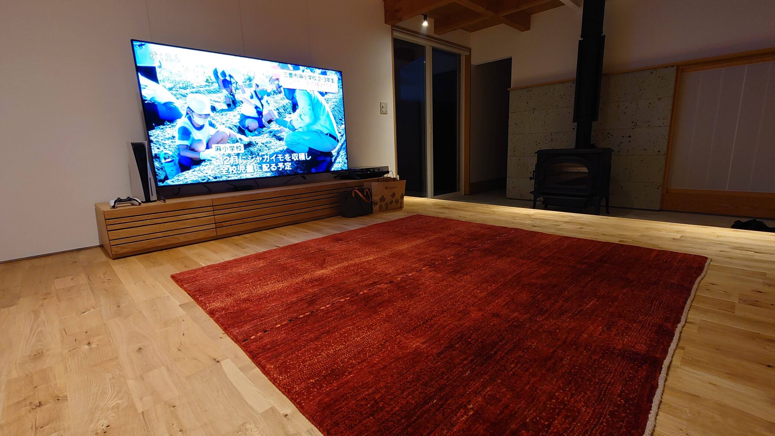 のダイニングセットと赤い正方形ギャッベをお届けさせていただきました。木のいい香りと目に優しい温かみのある空間に存在感があるどっしりとした欅のテーブルが非常によく映えています!見ていて癒されます。この先の木の経年変化も楽しみですね。珍しい正方形の赤いギャッベも空間にとってもマッチしております!
