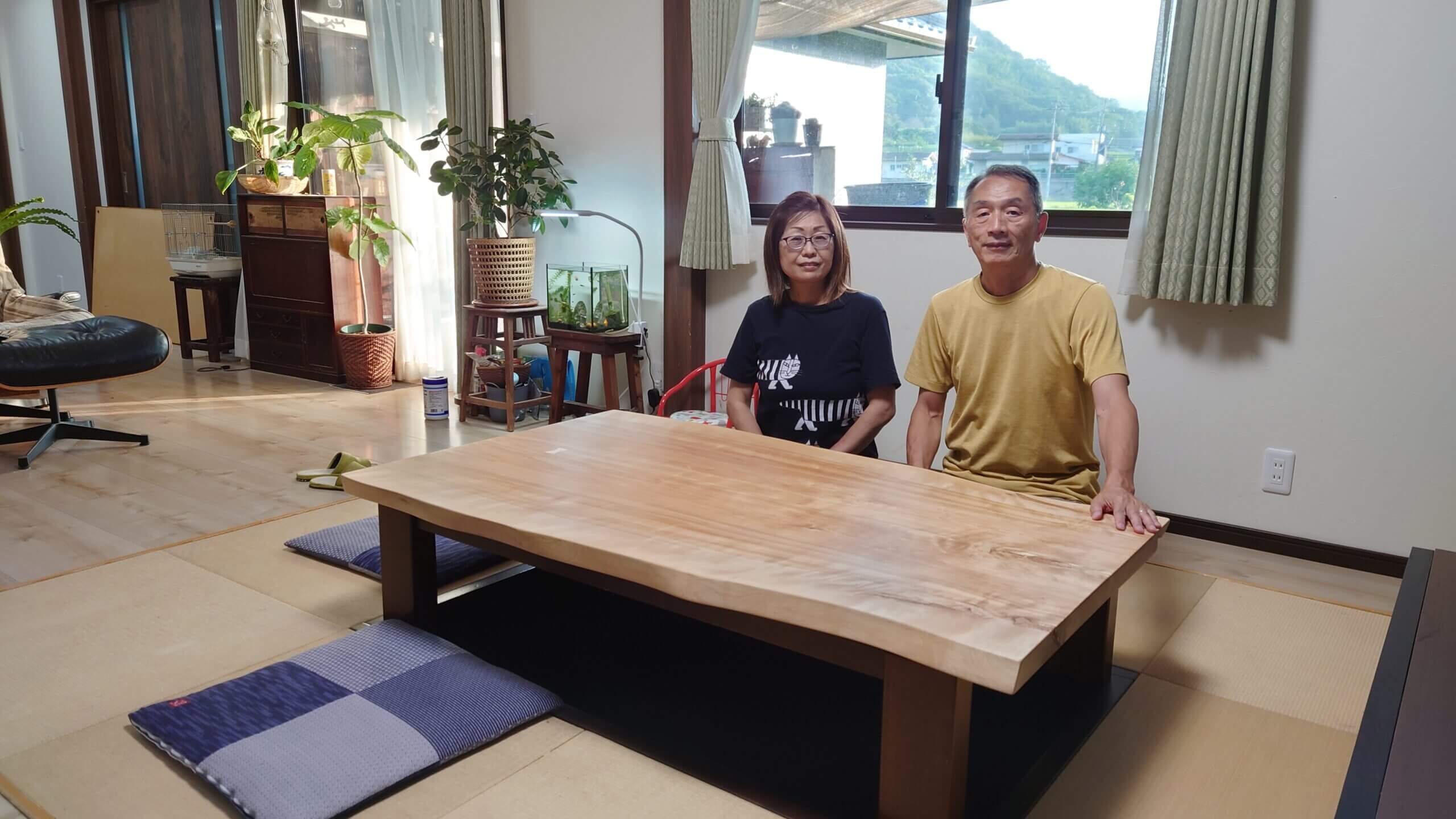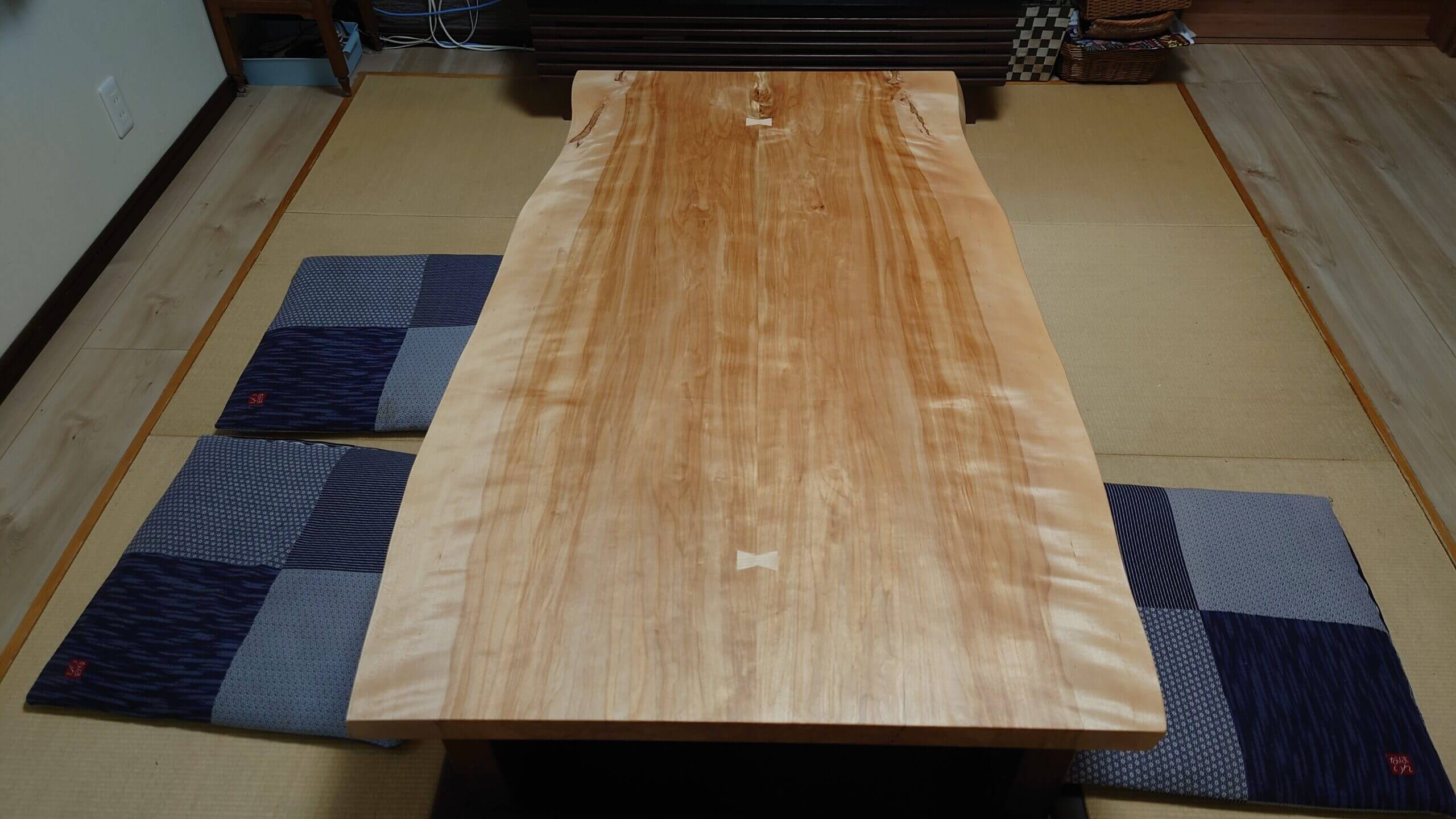掘りごたつの天板を、カバ桜のブックマッチにしていただきました!縮み杢が出るのは珍しく、全体に出ると天板が輝いて見えます!明るいナチュラルなリビングにピッタリの天板ですね♪