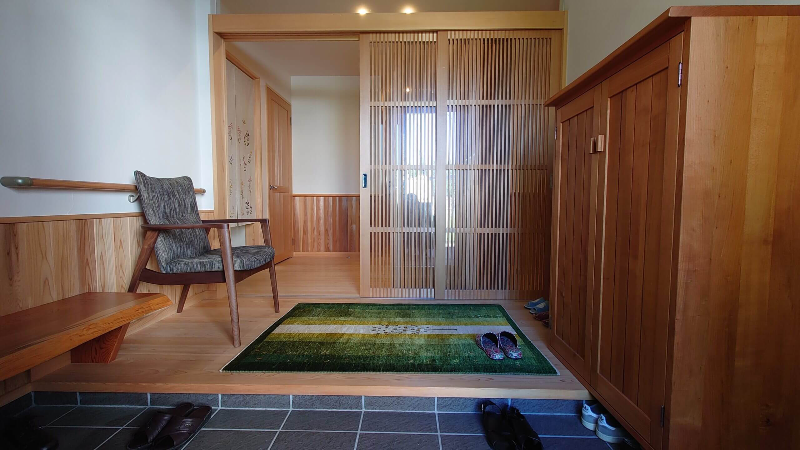 山桜のオリジナル下駄箱。ウォールナットフレームにグレーの布を合わせて落ち着いた雰囲気のイージーチェア。ギャッベはグリーンのカシュクリでサイズがザロニムサイズ(約150×100)!それぞれの良さが引き立っていて、とても良い玄関スペースになっています。