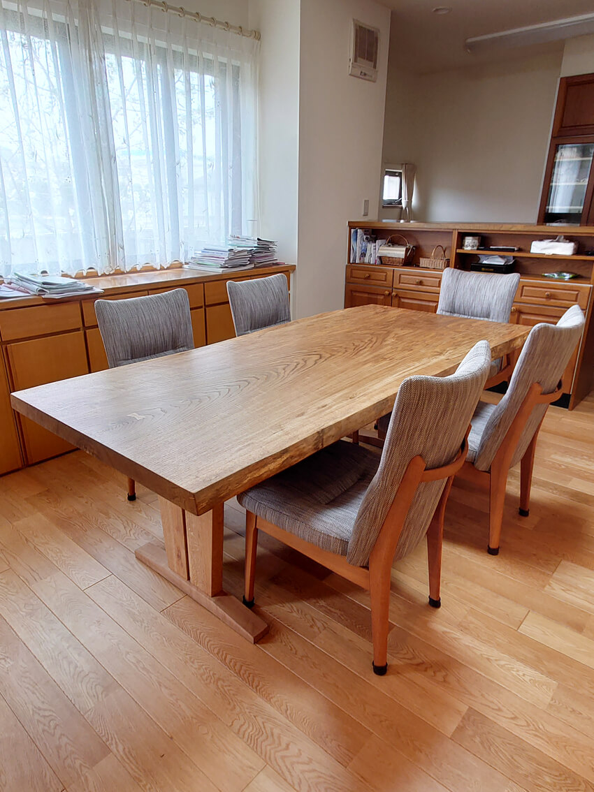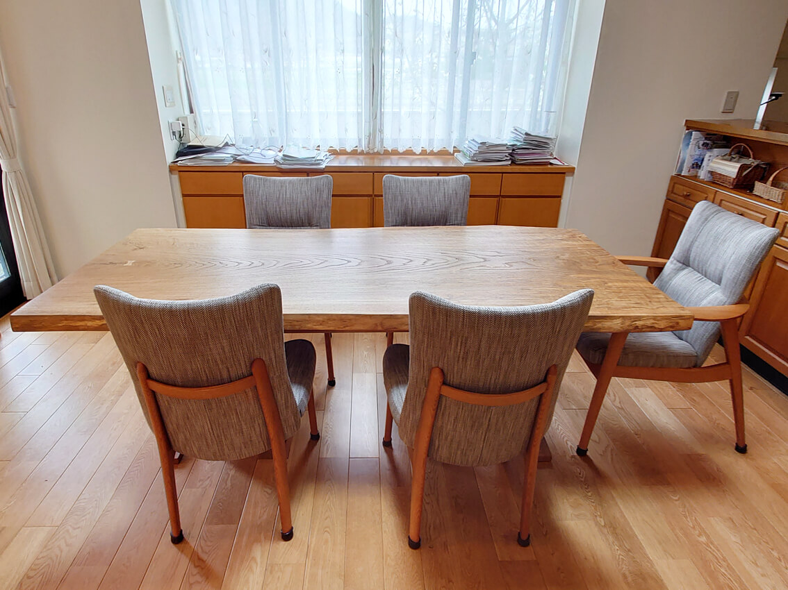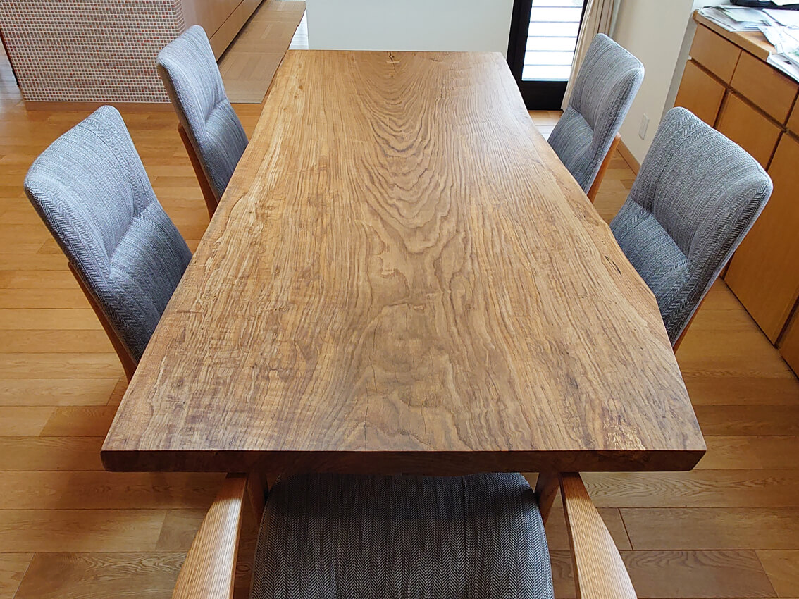 迫力のある楢の木の一枚板、厚みがしっかりのあるので存在感抜群ですね!広いダイニングスペースにピッタリのテーブルと椅子も大きいサイズでゆったりお使いいただけます!