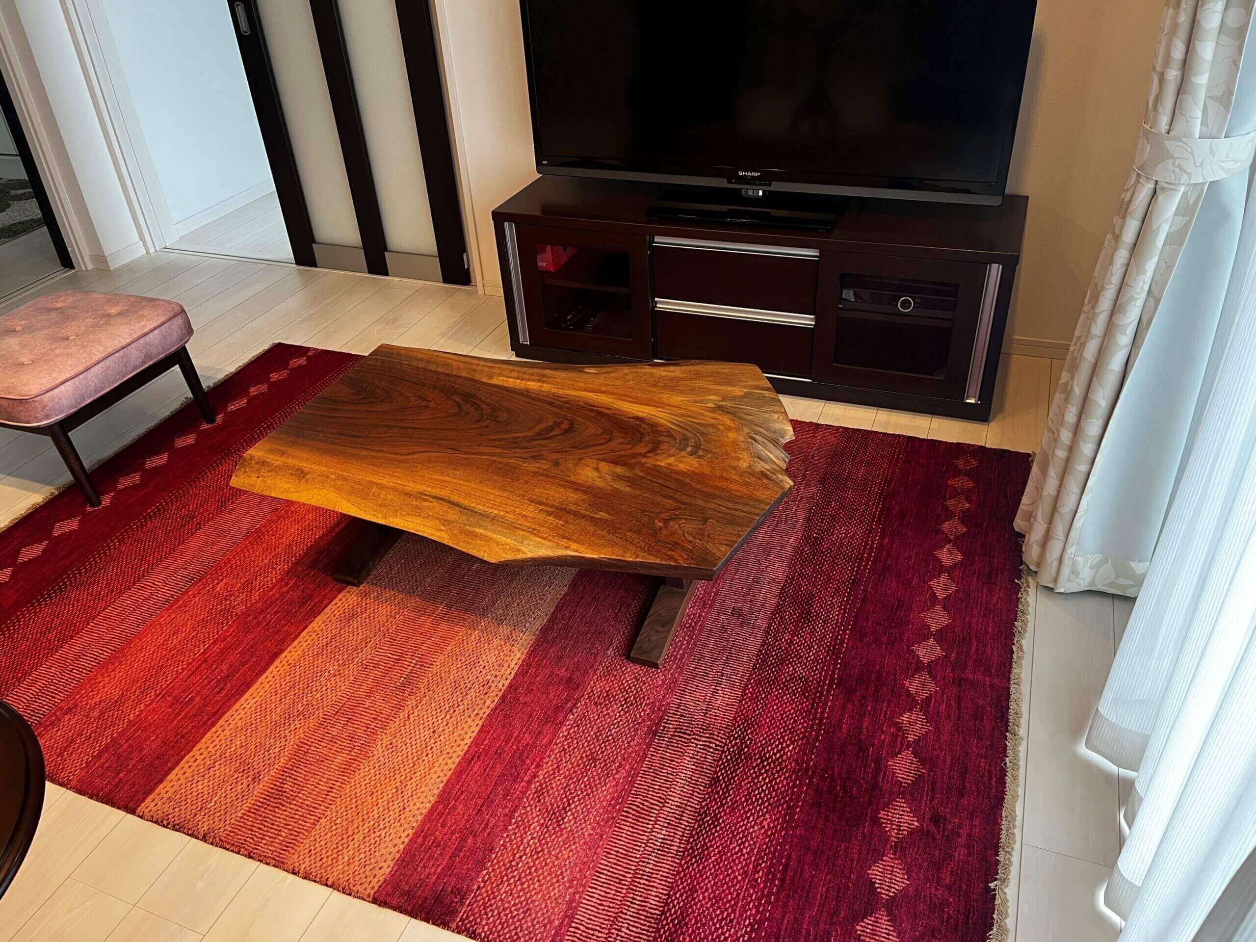 とっても素敵な雰囲気のリビング。綺麗な赤色のラグの上にウォールナットの一枚板がとてもお似合いです!