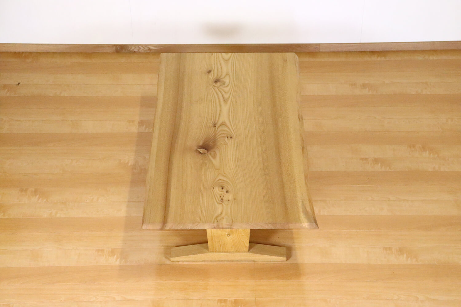 リビング2枚脚A。板の目が細かく、落ち着いた木目が魅力的な楡の一枚板。天板の厚みが少し薄く、広葉樹の木の中では重さが軽い方なので、お掃除など少し移動させるのも楽でいいですよ。