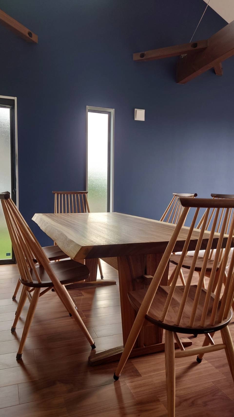 ウォールナットのフローリングと濃い壁紙に、ツートンカラーの当店人気のシビルチェアモンキーポッドの一枚板がとってもよくお似合いです!