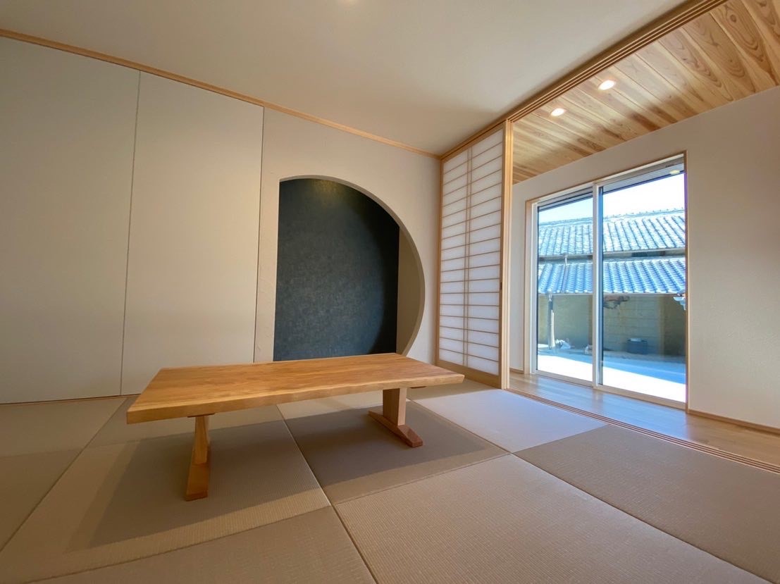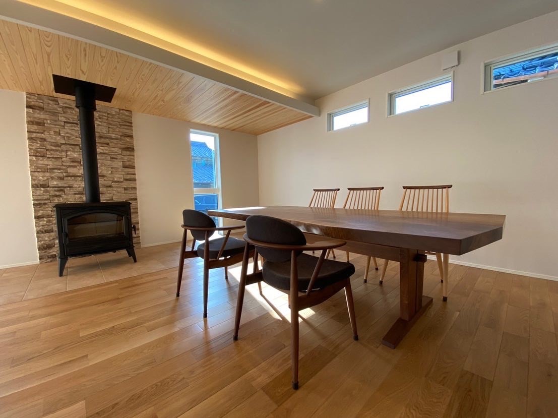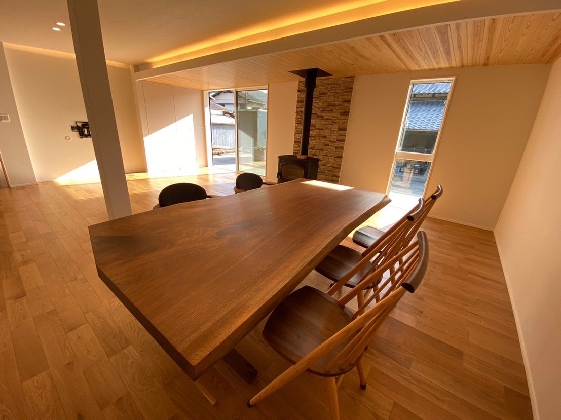 一年以上前にご購入頂いてお預かりしていた家具をご新築のタイミングで納品させていただきました!家具は両手をいっぱいに広げてようやく持てる特大サイズのウォールナット一枚板とチェア5脚、和室用カバ桜のリビングテーブルをお届けです!