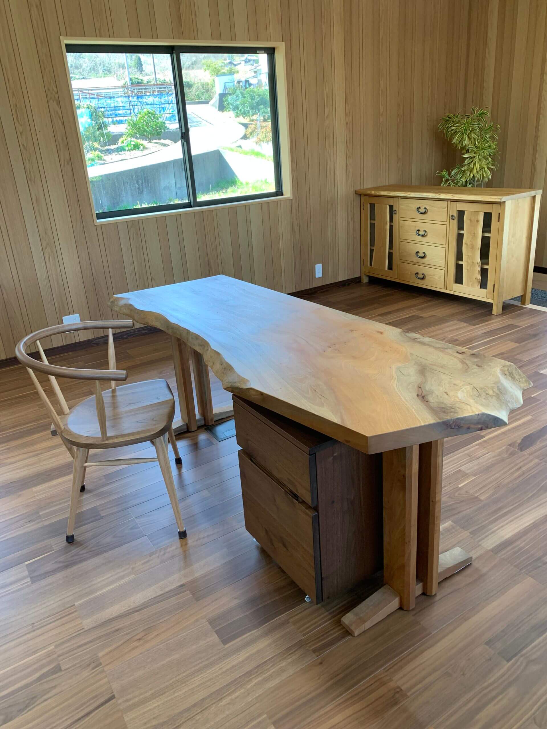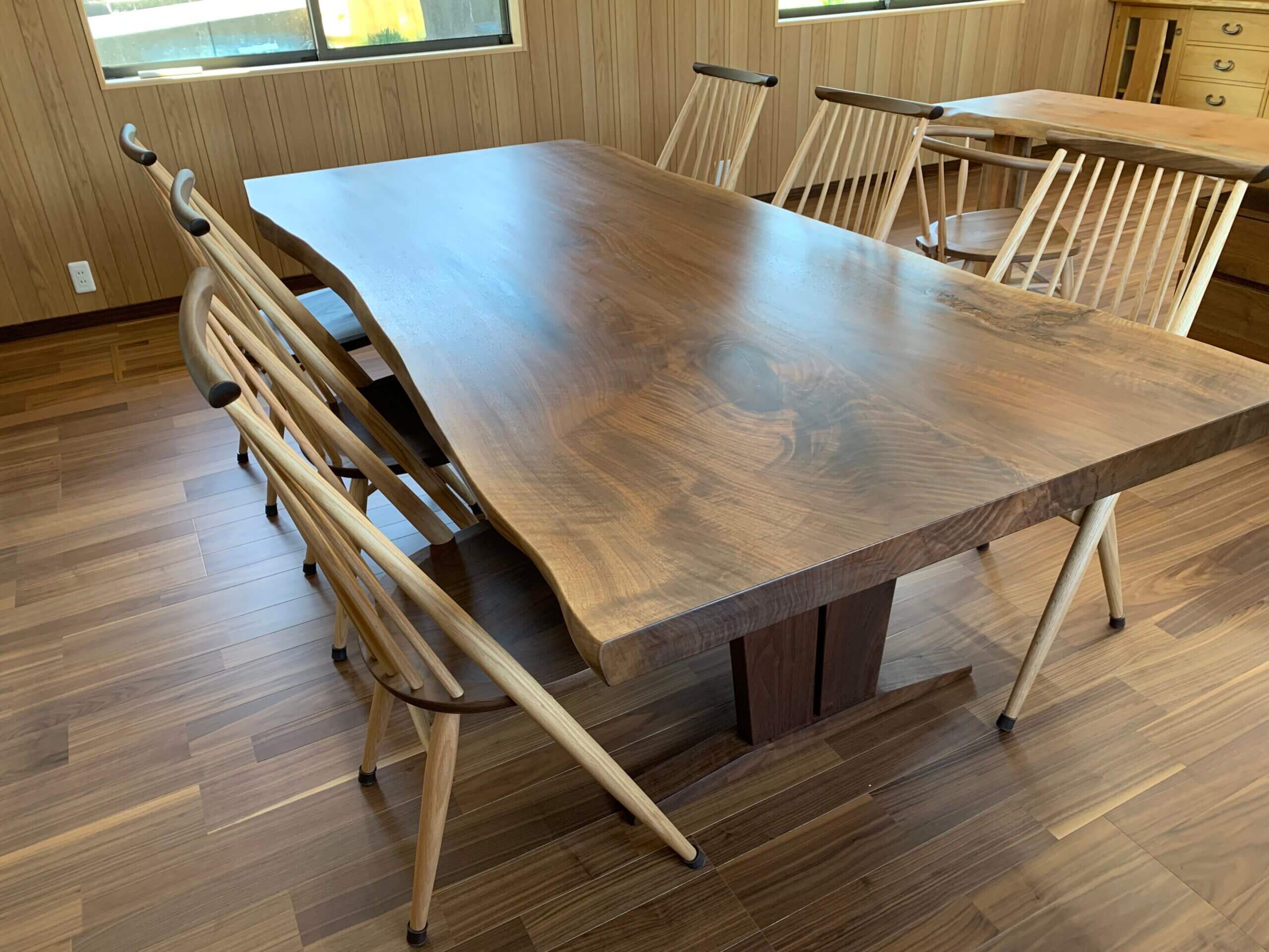 新社屋の完成記念にご購入いただきました!ウォールナットの一枚板テーブルは2400㎜を超えるビッグサイズです、タブの一枚板デスクや栗の木リビングボードを全てすぎむらにてご用意させていただきました!スタッフ様が快適に過ごせるステキな空間に仕上がったと思います。ご購入いただきありがとうございました!!
