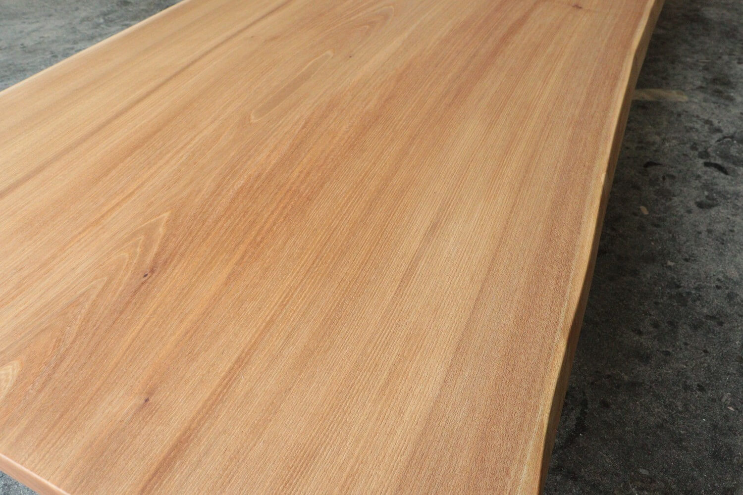 こちらの一枚板は木目が真っ直ぐ通る柾目と呼ばれる部分の比率が多く、一つ一つの木目がくっきりと密に一直線で伸びる木目が魅力の楡の良さが詰まった一枚です。