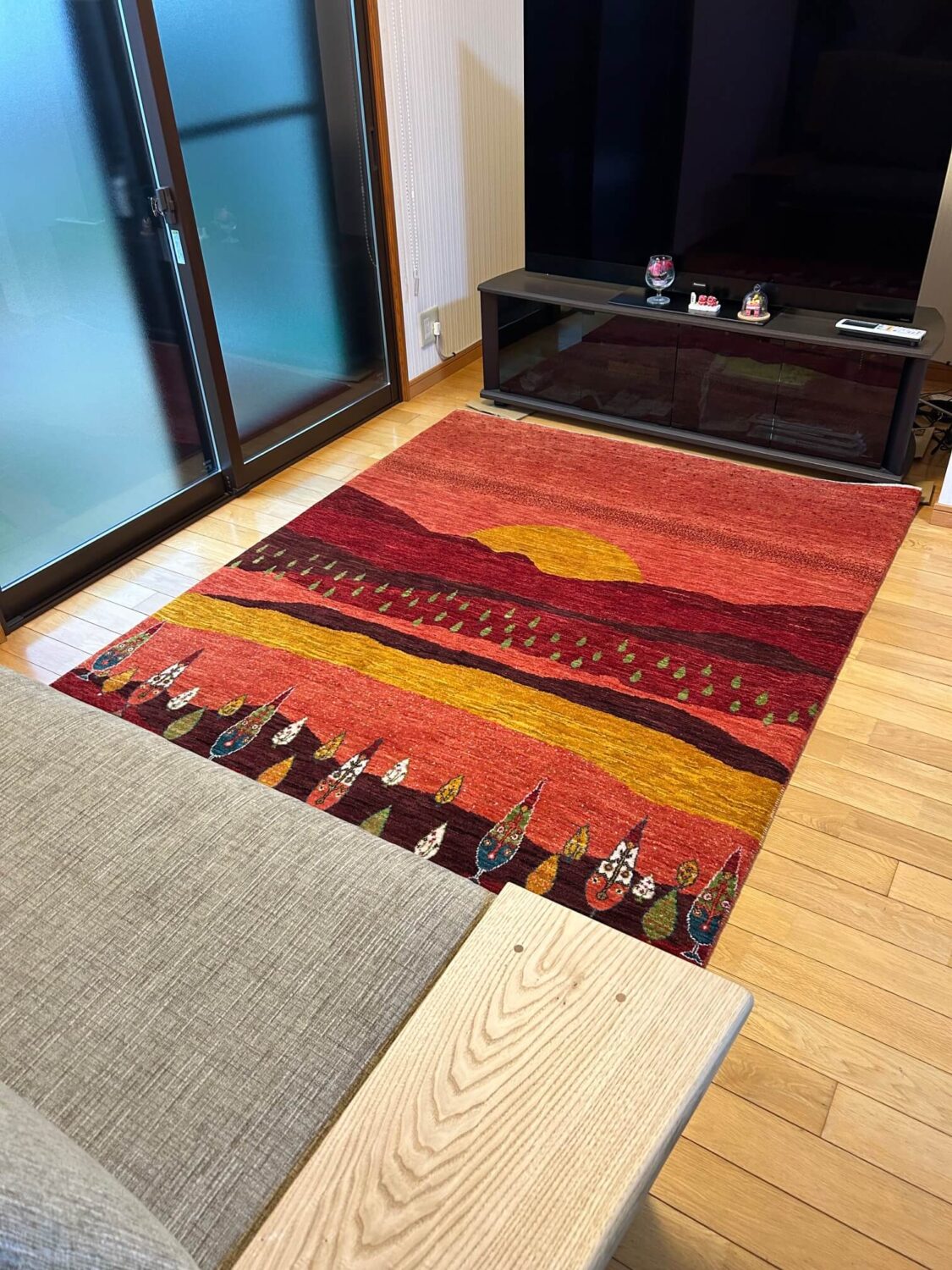 ランドスケープ(風景)と呼ばれるパターンの中でも特に印象的な茜色のギャッベをとても気に入って下さりました(^^)