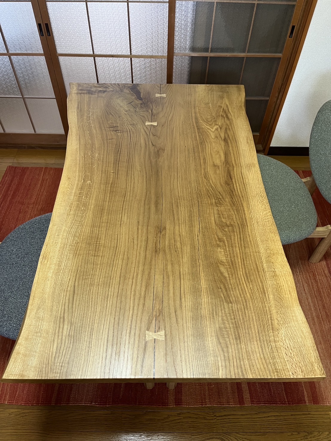 最初はカバ桜のブックマッチテーブルをお探しでしたが、ナラ材の一枚板テーブルに一目惚れ(^^)