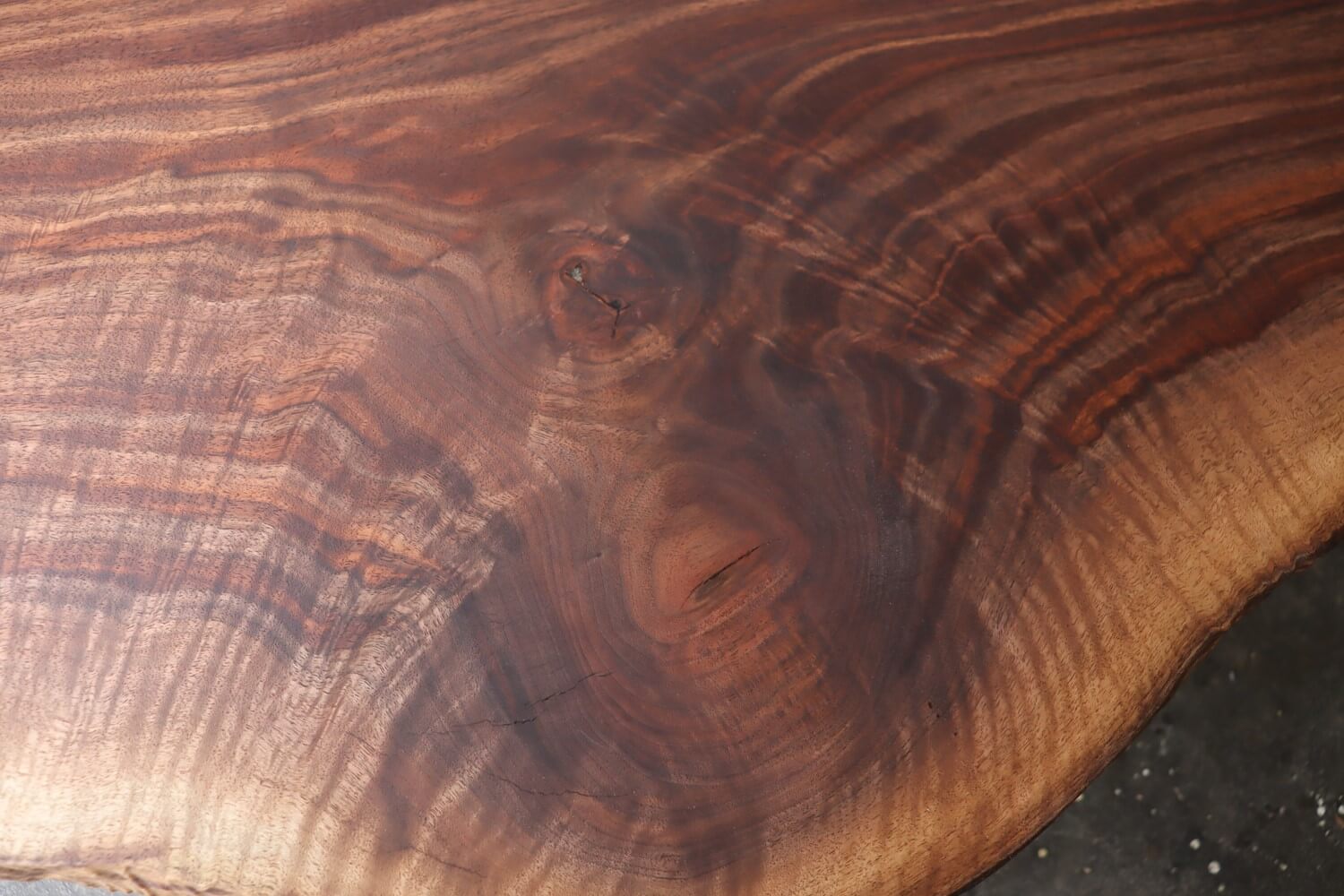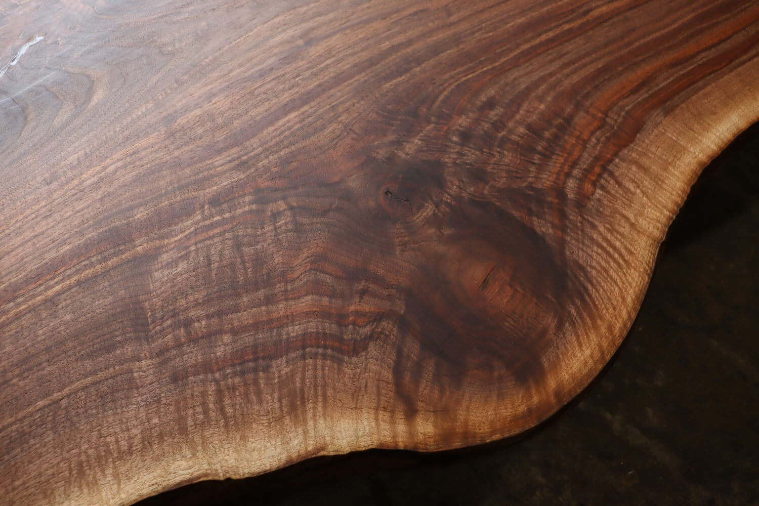 ウォールナットらしい荒々しい木目と、茶色から黒に近い色調の赤身の色は黒光りする様な深みががあり、他のウォールナットに比べて非常に濃い色に仕上がっています。