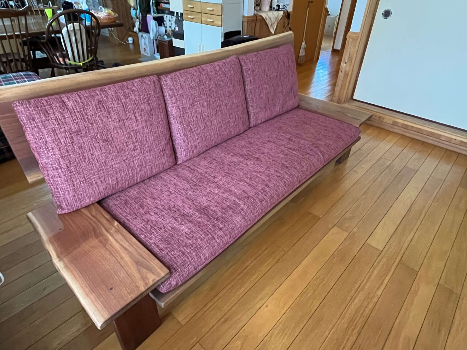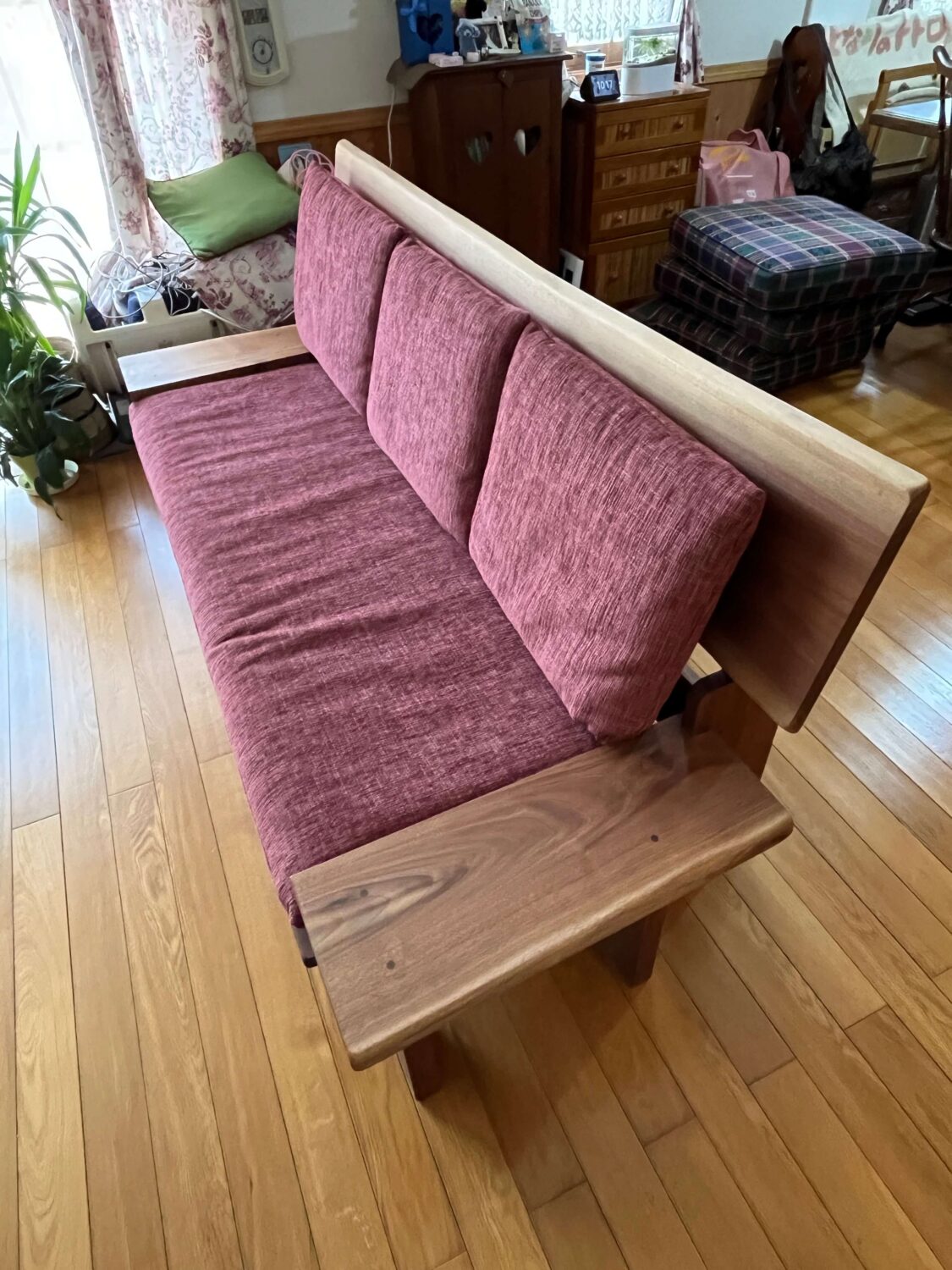ウォールナット特有の重厚感のある色とクッションの色味がマッチしてとても綺麗に仕上がったソファ(^^♪