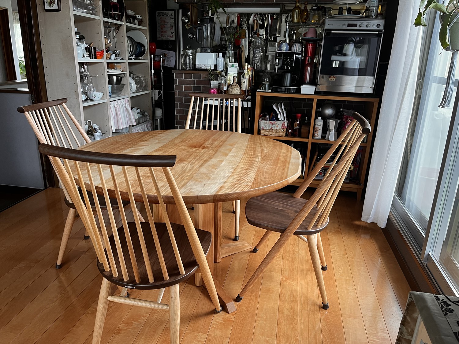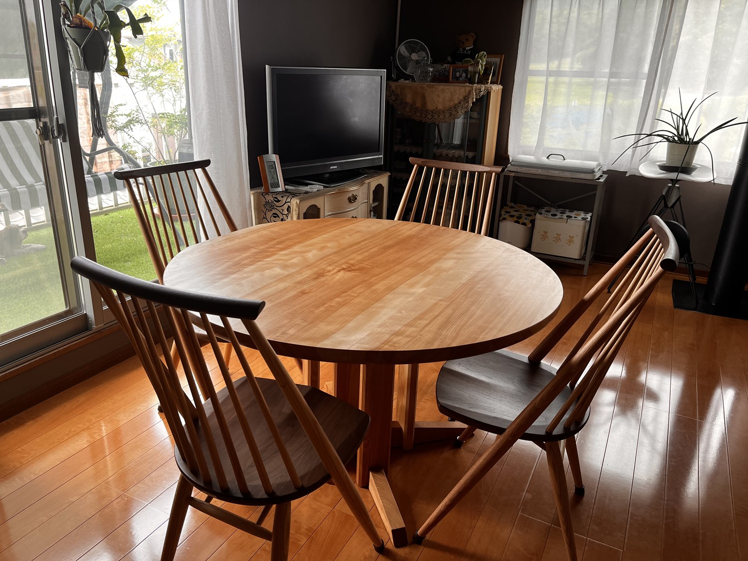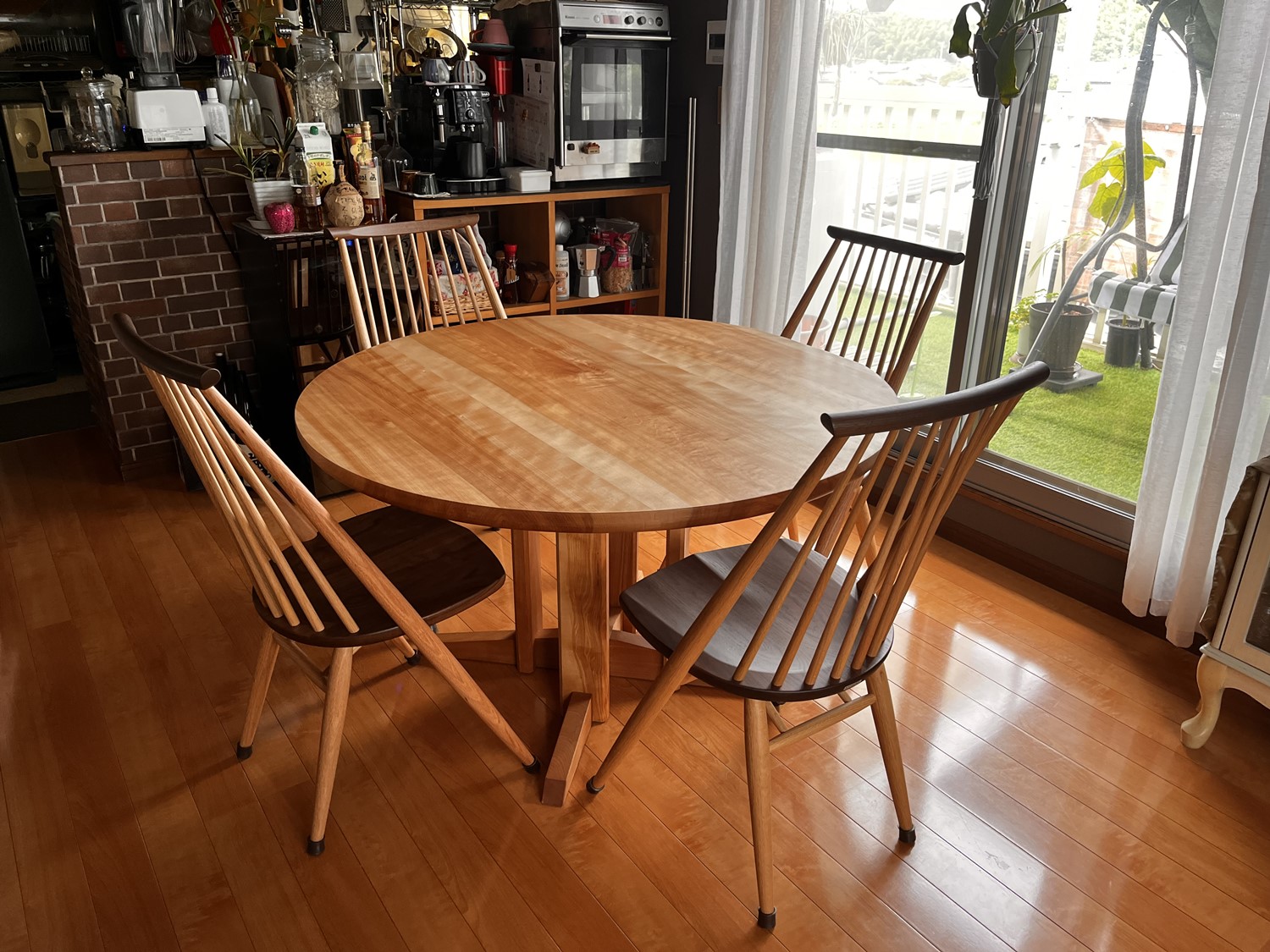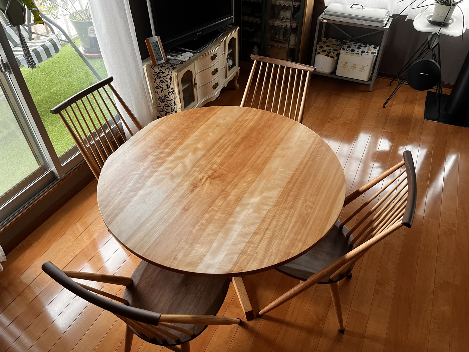 丸テーブルには木目の美しいカバ桜を使用し、明るい風合いが室内をより一層明るく感じさせてくれます。