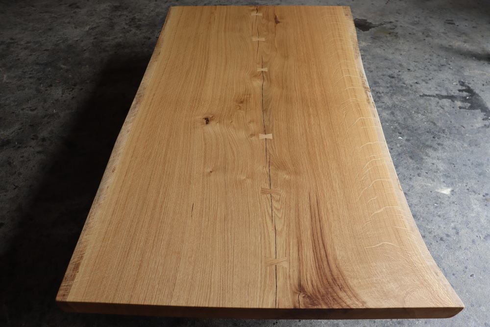 4名様でゆったりとご使用になれるサイズの楢の一枚板が仕上がりました!ジャパニーズオークと世界でも評される北海道産の楢を仕上げたもので、乾燥に気を遣い長い歳月を経てようやく仕上げに取り掛かった自慢の一品です!同材のチギリも合計6つ入っており手作り感が満載の温かみのある一枚となっております。強度、硬度ともにしっかりしているため日常使いで気を使うこともありません。是非ご使用されてみてはいかがでしょうか?