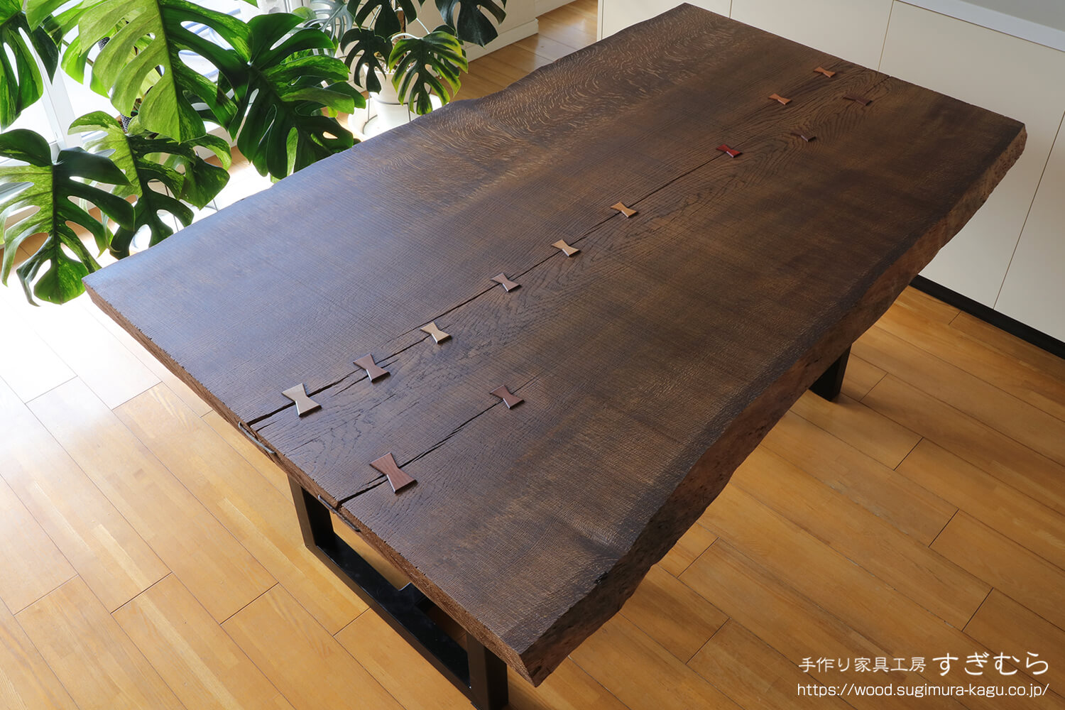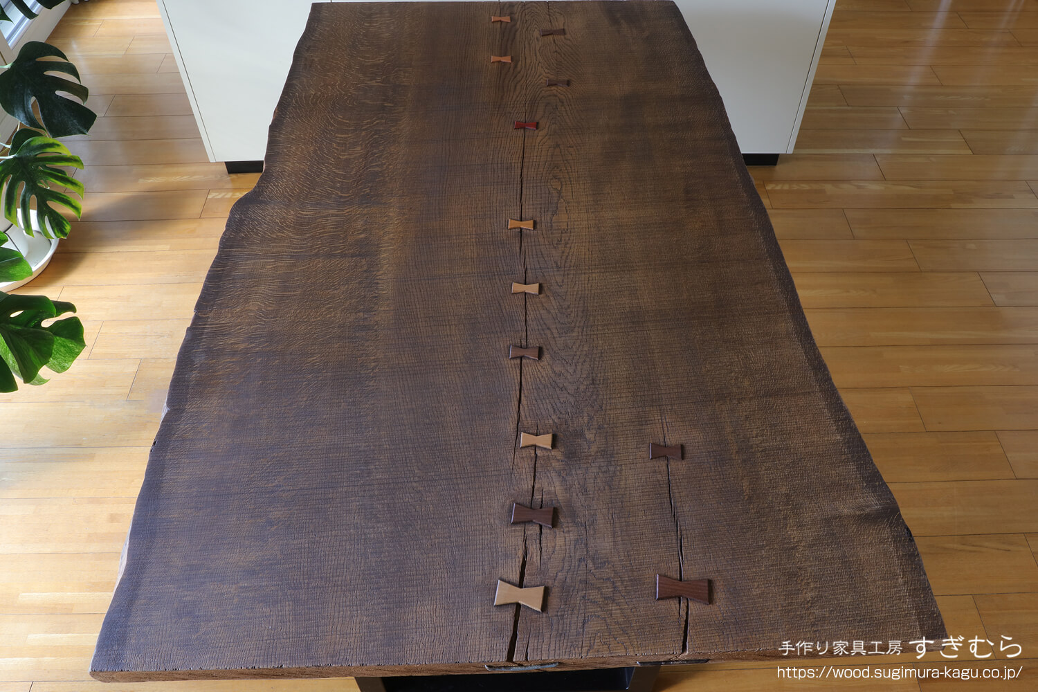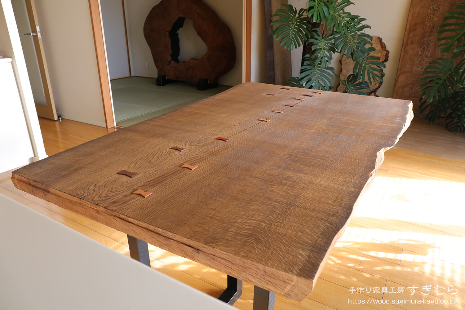 そして木口には、鎹(かすがい)が付いています。仕上がった一枚板に鎹(かすがい)が付いているのはなかなか見かけないと思いますが、「結」仕様の一枚板テーブルだからこそ鎹(かすがい)が付いている事でカッコよく見えます。