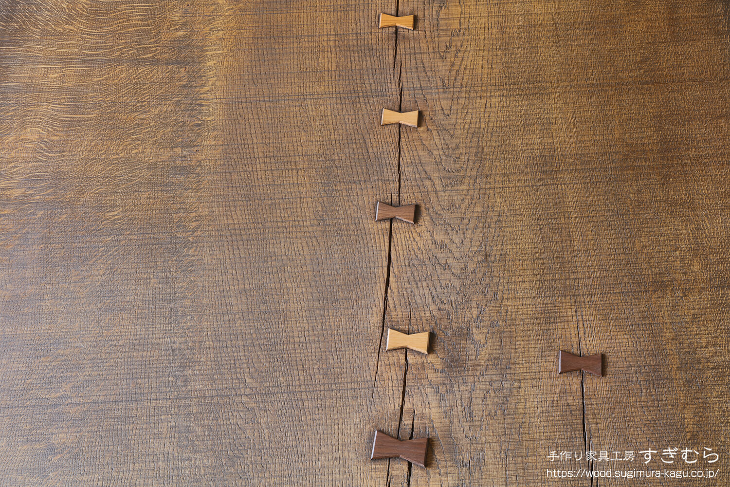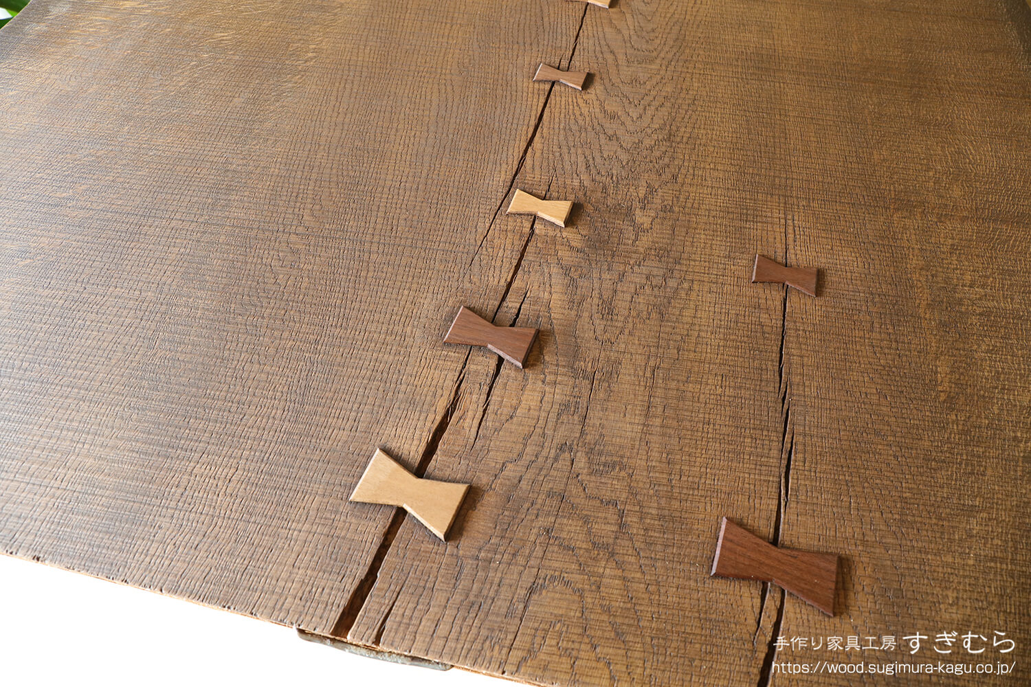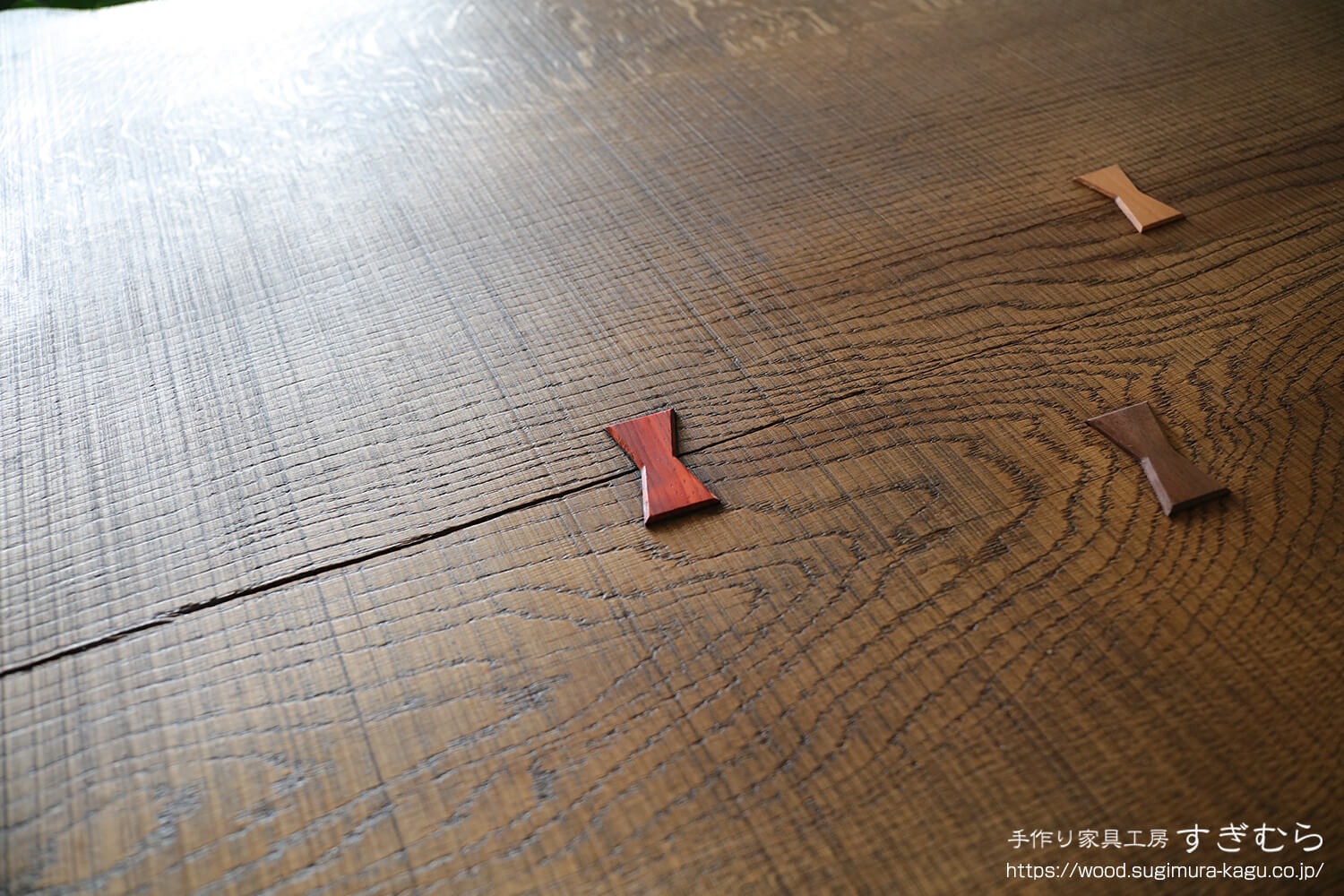 そして木口には、鎹(かすがい)が付いています。仕上がった一枚板に鎹(かすがい)が付いているのはなかなか見かけないと思いますが、「結」仕様の一枚板テーブルだからこそ鎹(かすがい)が付いている事でカッコよく見えます。
