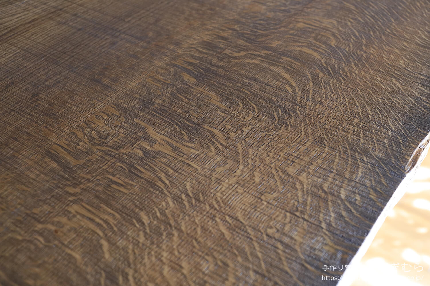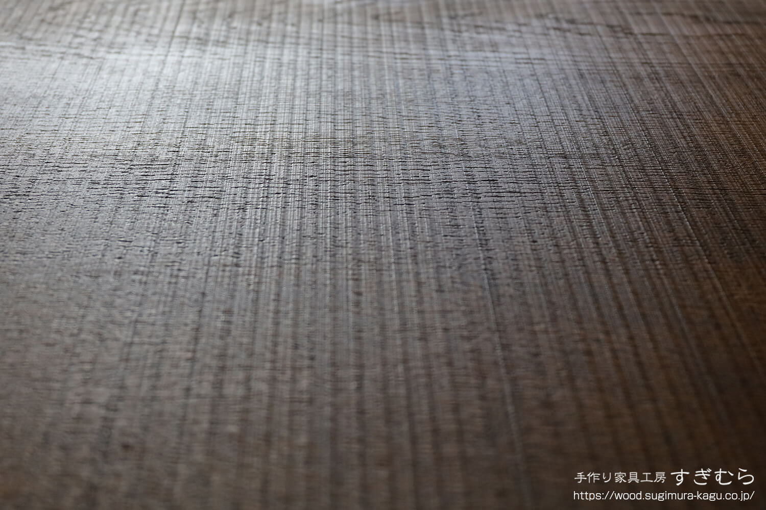 木地面は板の挽目をそのまま生かした仕上がりとなっています。商品化された一枚板のほどんどがツルツルに仕上げられていますが、「結」仕様の一枚板テーブルは触れると木の質感が指先からダイレクトに伝わってきます。