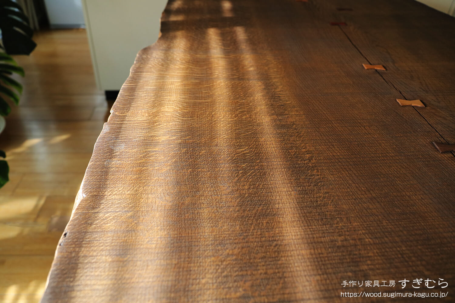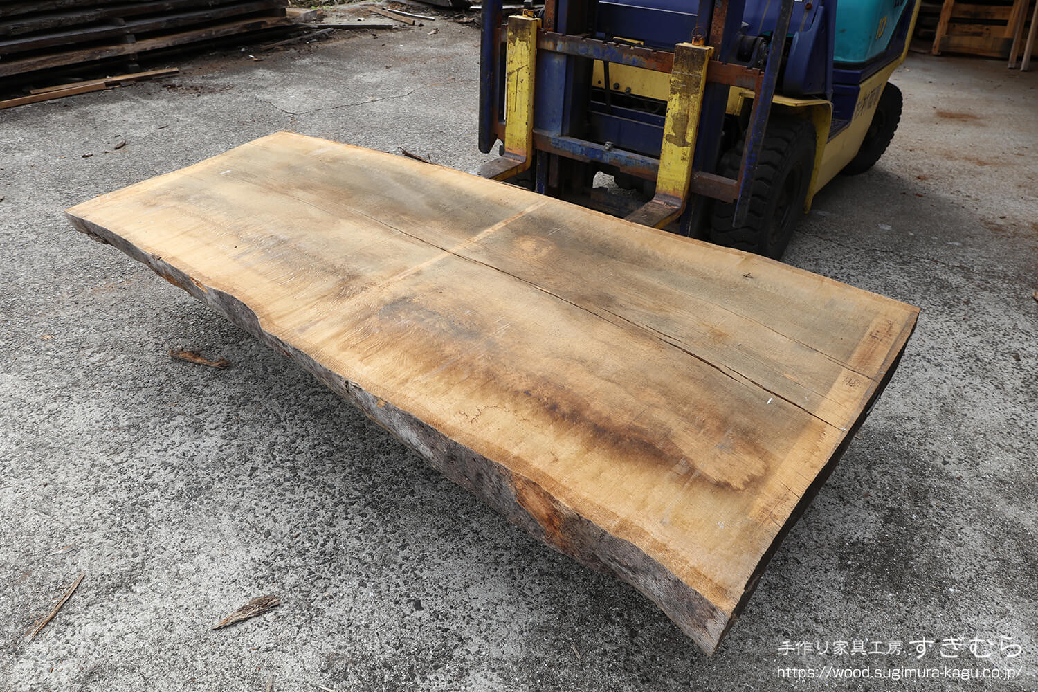 粗木の状態でも美しい斑が確認できる貴重な楢の一枚板です。E様曰く日本全国で楢の一枚板を探してきたけれども、当社が在庫する楢が一番美しいとのお褒めのお言葉をいただいております。