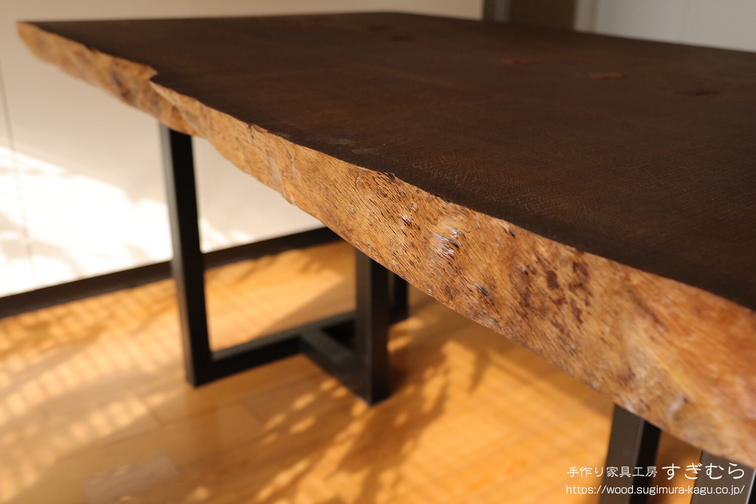 木材の良さをそのままに仕上げた「結」チェアの雰囲気を一枚板で実現して欲しいと鎌倉市のE様よりご依頼いただき仕上げさせていただきました。E様には鎌倉から当社までご来店いただき、粗木の状態からご確認をいただきました。E様からは綺麗な一枚板では無く、木の特性である割れや捻じれがある一枚板を「結」チェアの雰囲気で仕上げて欲しいとのご依頼だった為、こちらの一枚板をご提案させていただきました。