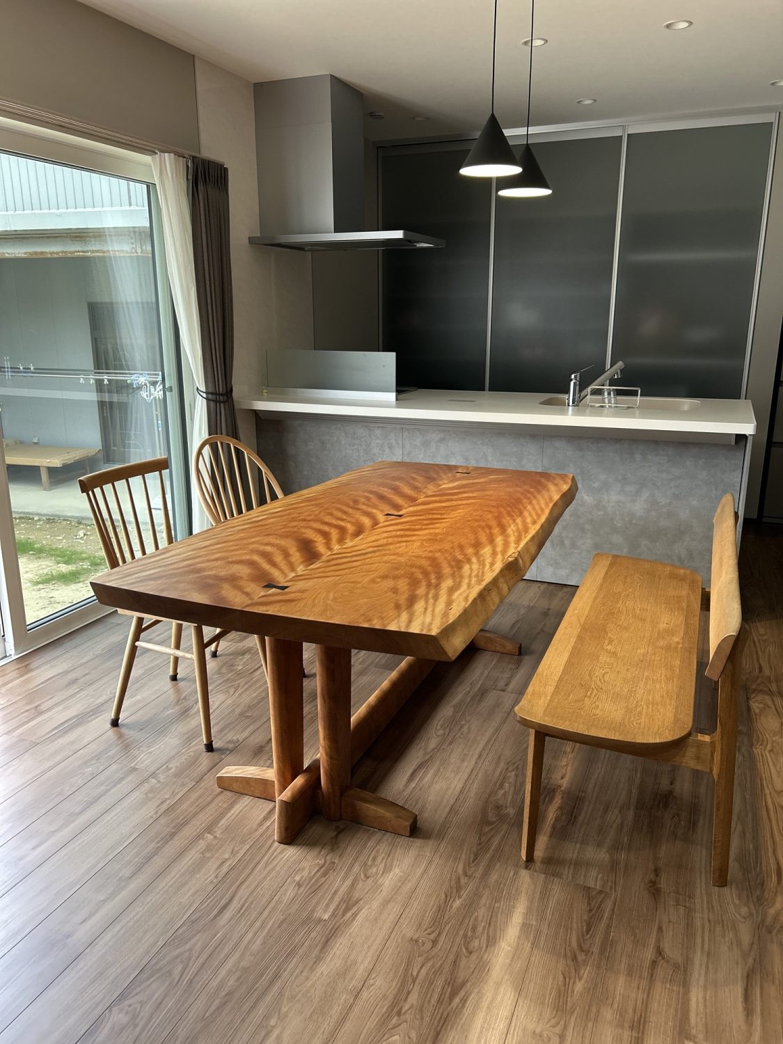 水目らしい燃えるような心材の色合いが素敵なテーブルが新たな新居にとってもお似合いでした(^^)