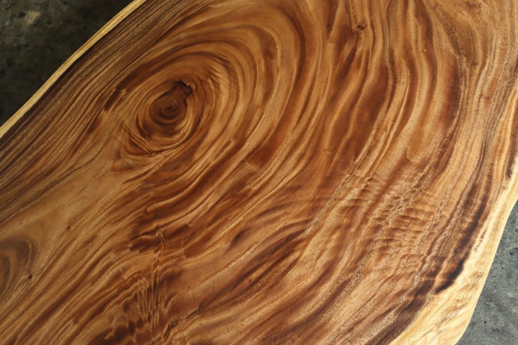 一つの節を中心に渦巻くように木目が広がり、モンキーポッドではなかなかお目にかかることのない縮杢が所々で光り輝くなんとも魅力的な一枚。