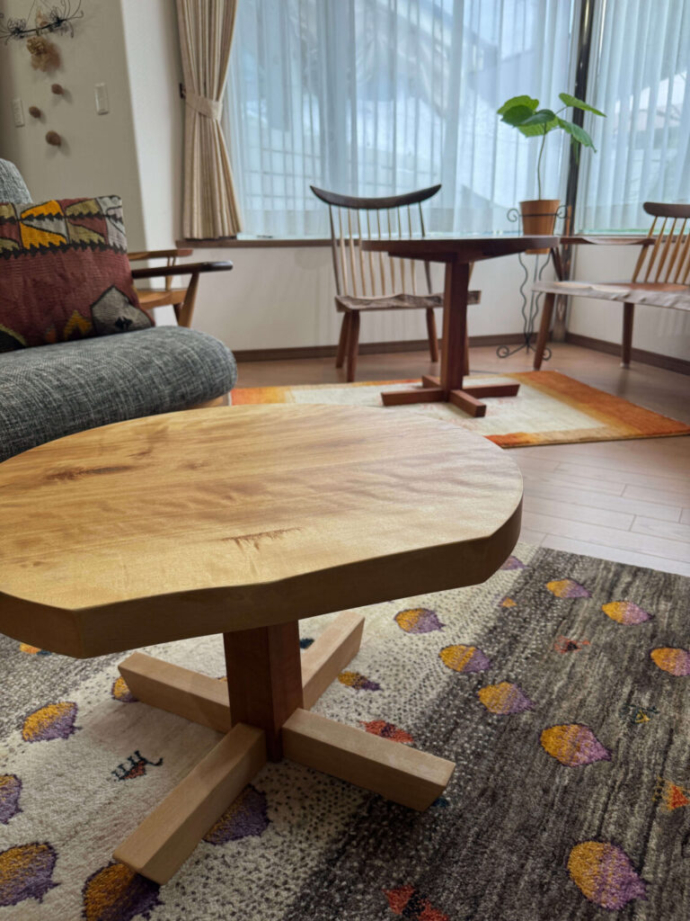 カバ桜材で製作したLowタイプはミニテーブルとして可愛い仕上りソファの前に、以前にお買い求めいただいたギャッベとの相性もとても素敵でした('ω')