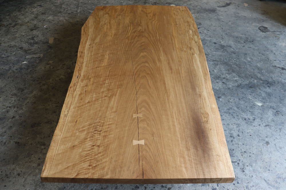 6~8名様がゆったりとお使いになれる存在感のある楢の一枚板が仕上がりました!幅も平均1m程度あり、大人数でのお食事がより一層楽しめる一枚となっております。私たちが扱っている楢は家具メーカーが好む北海道産にこだわっております。強度も強いうえシミなどもつきにくく木目が綺麗な特徴があります。中央には割れ止めの同材のチギリがポイントで入っており手作りのテーブルの雰囲気を味わえること間違いなしです!