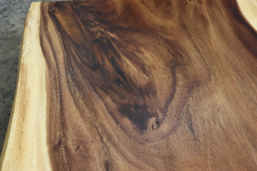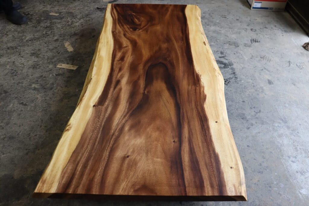 大きなうねりをもった躍動感あふれる板目がが全体に浮き出たモンキーポッドの一枚板が仕上がりました。