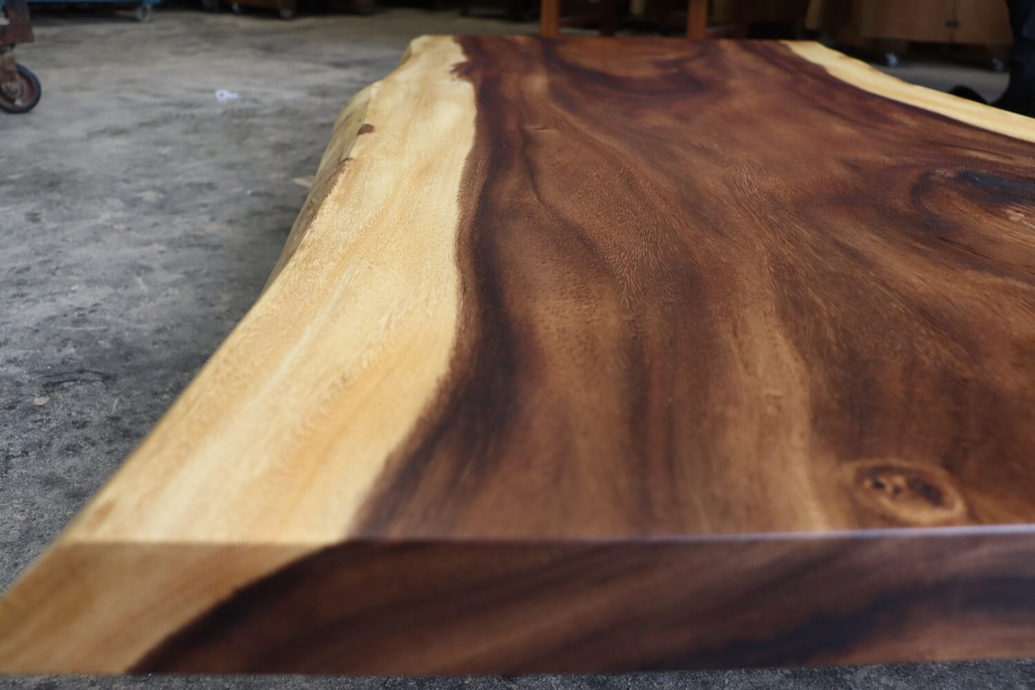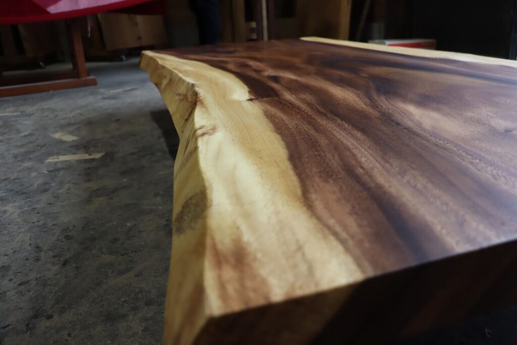 濃いブラウン色に加え、波打つような板目の赤身と、淡色で落ち着きのある乳白色の白太のコントラストがさらに明確になり、より存在感が増した一枚板。