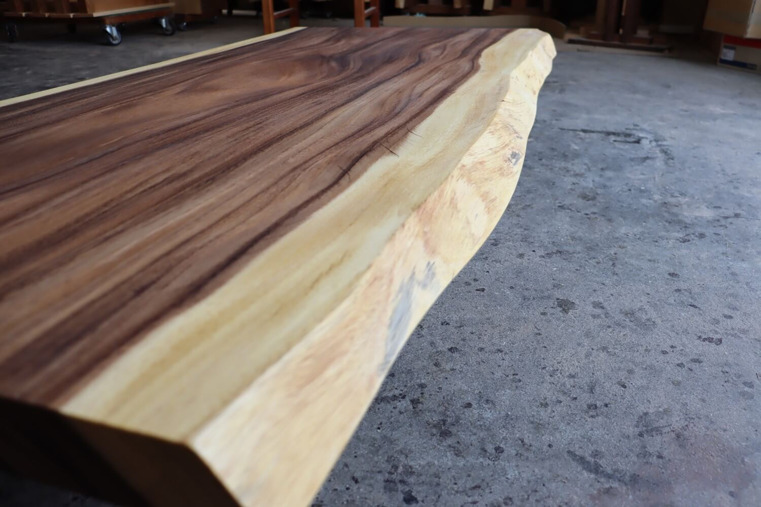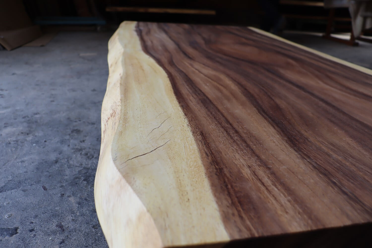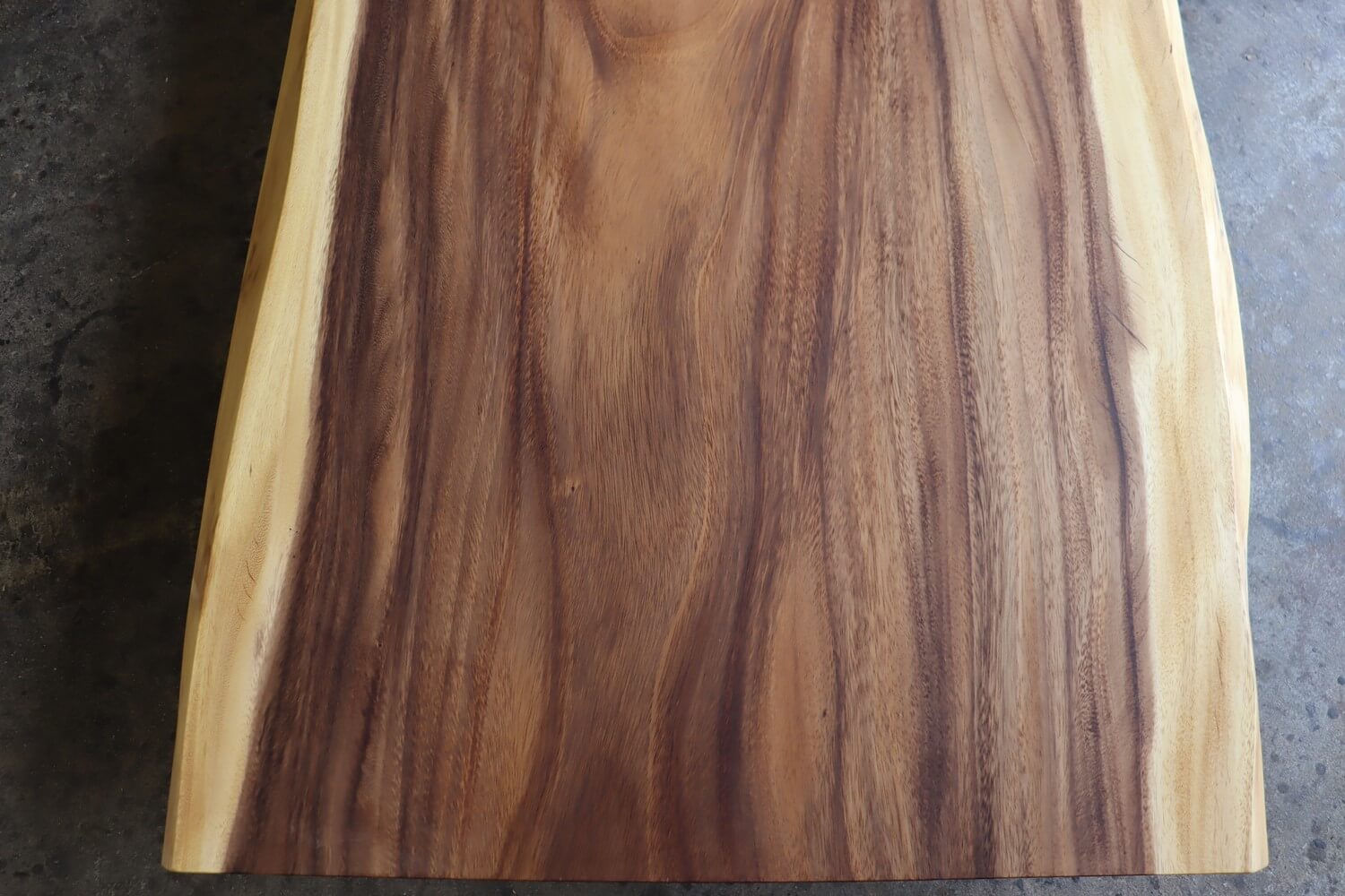 一本の樹で赤身部分の褐色の濃い色と、白太部分の乳白色の明るい色がこれだけはっきり分かれる材種は珍しく、合わせる椅子の選択肢が広がるのもモンキーポッドの魅力の一つ。
