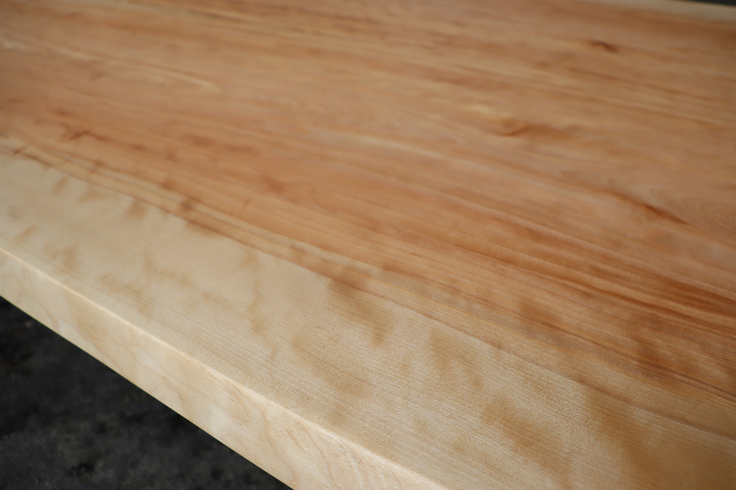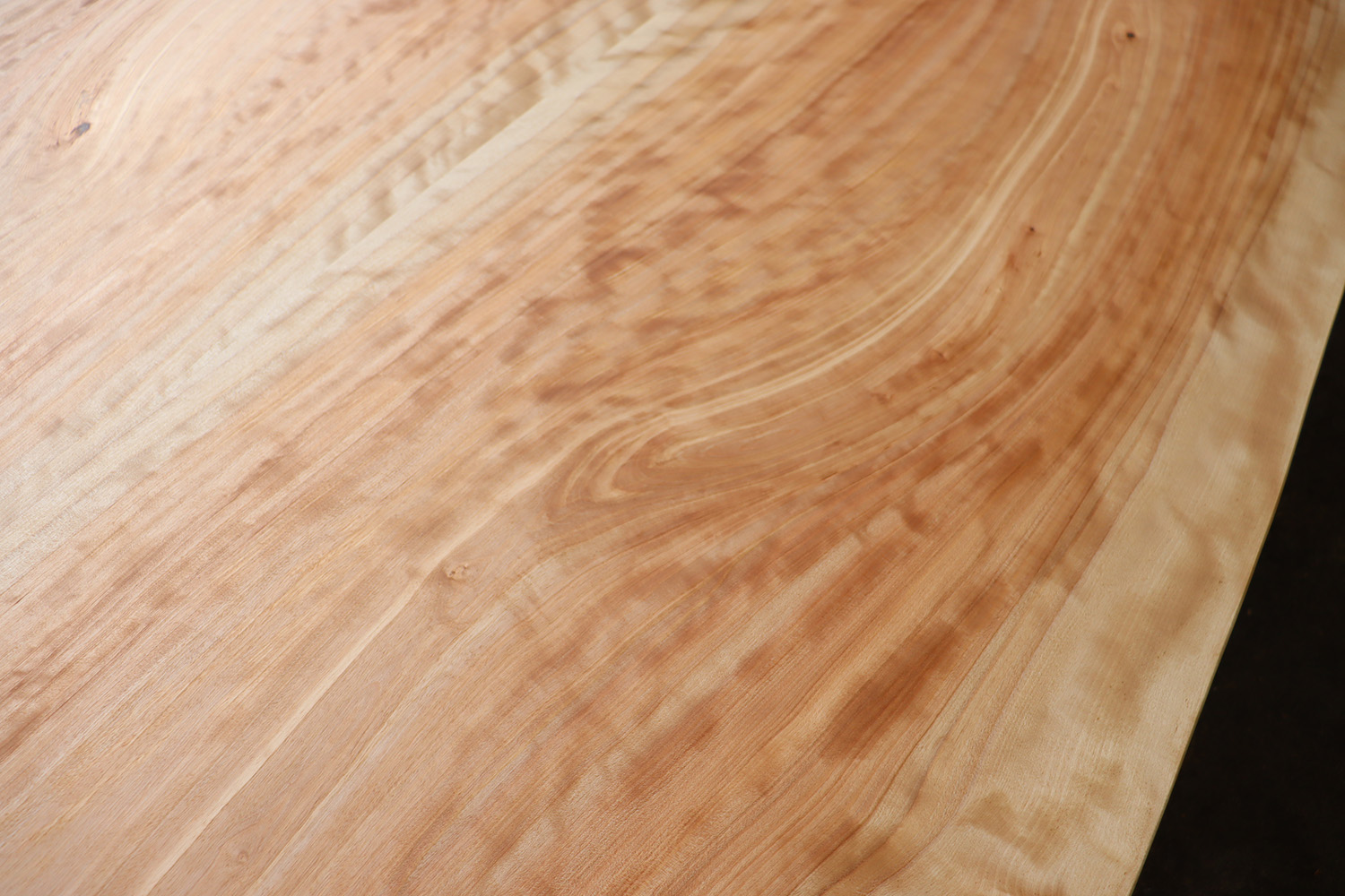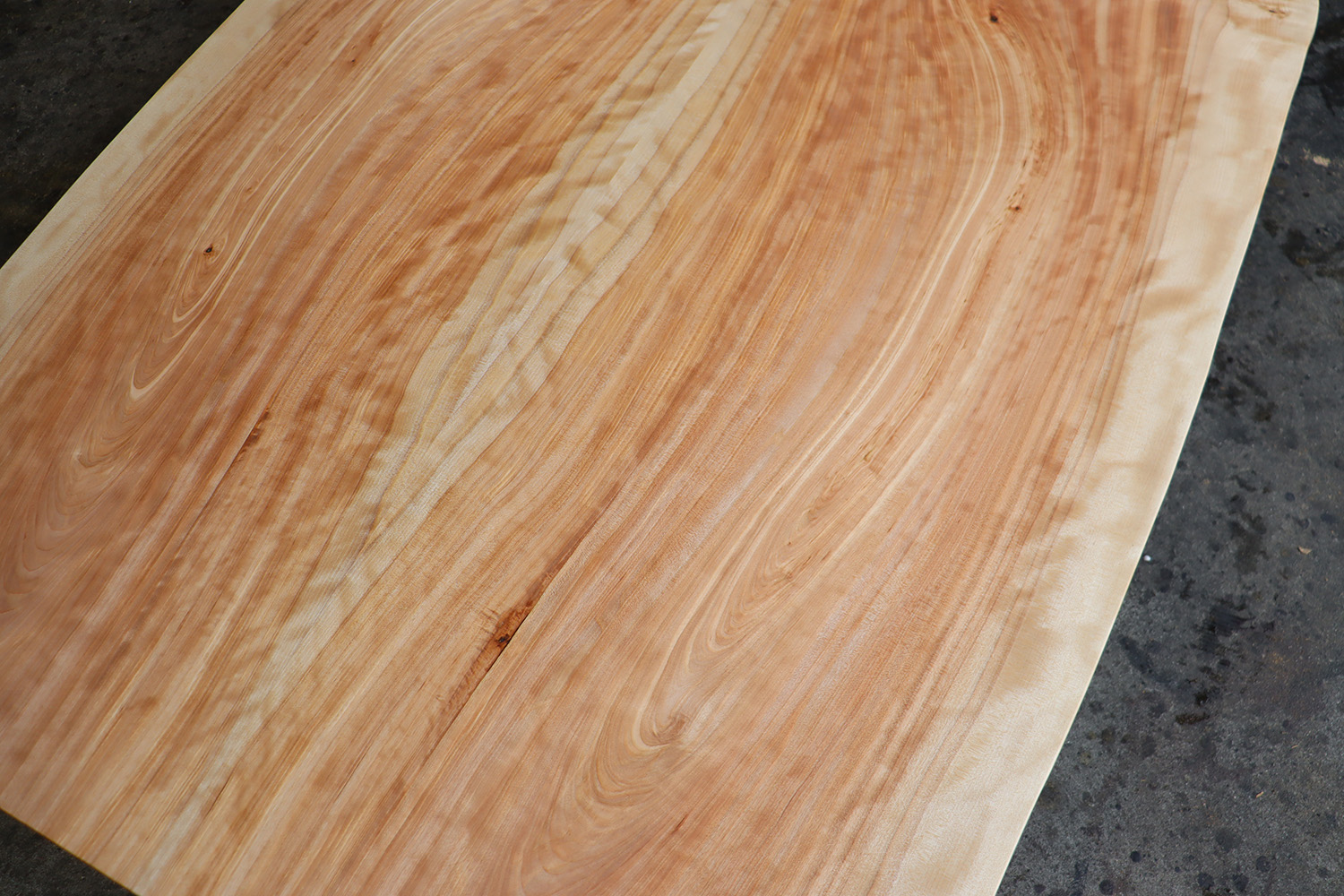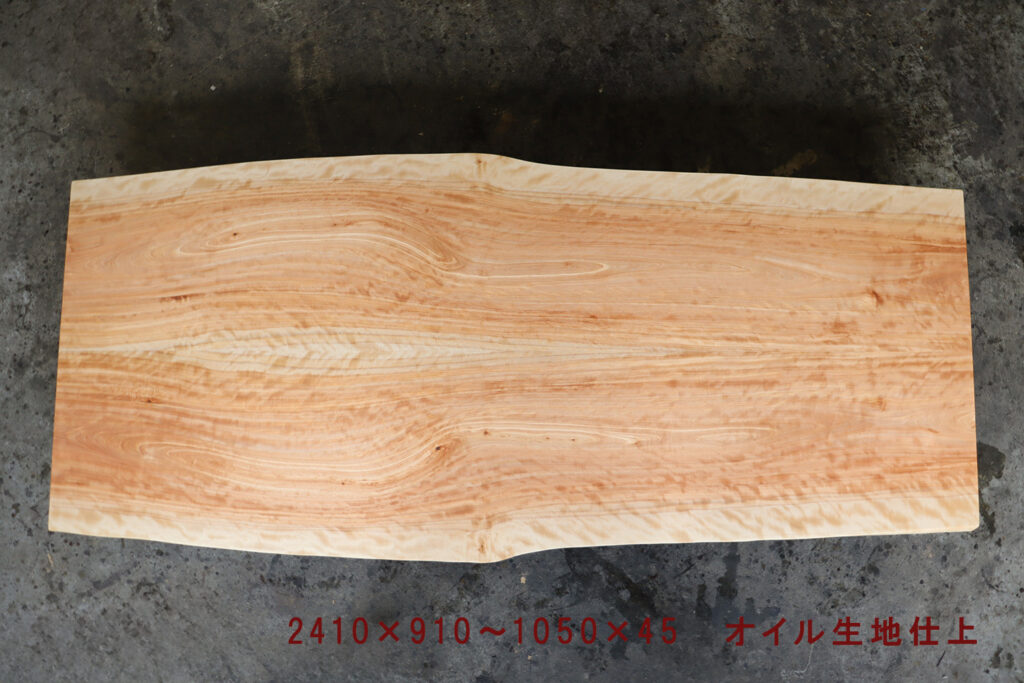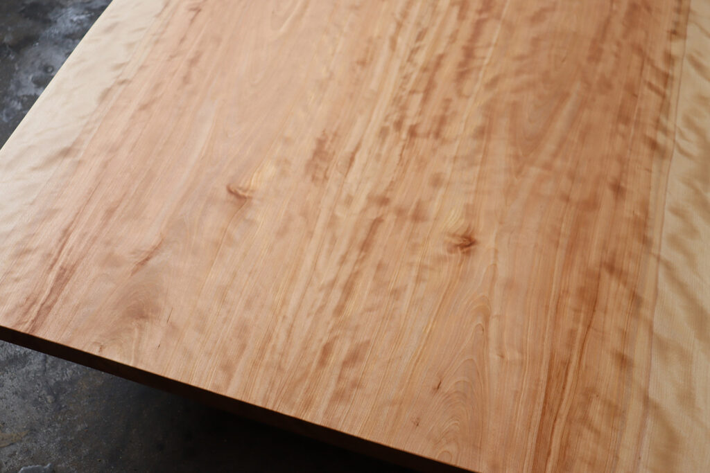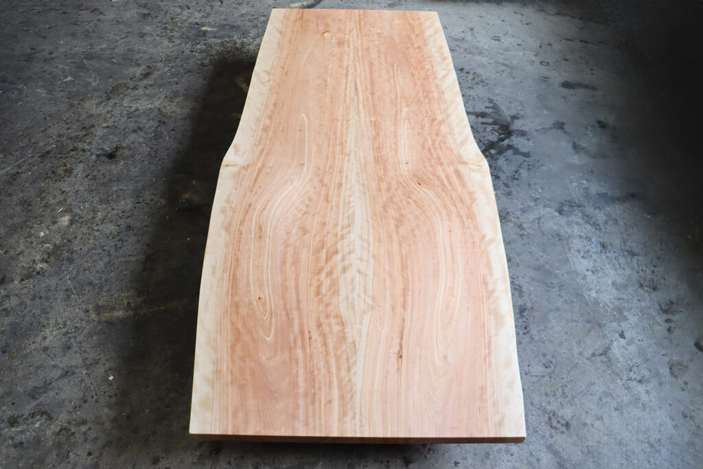 良質な杢目【縮杢】が全体に浮き出たカバ桜の2400mm、特大ブックマッチ天板が仕上がりました。
