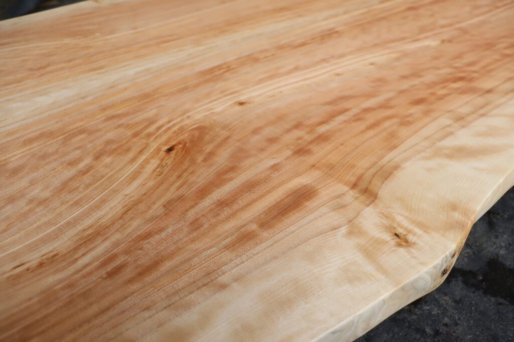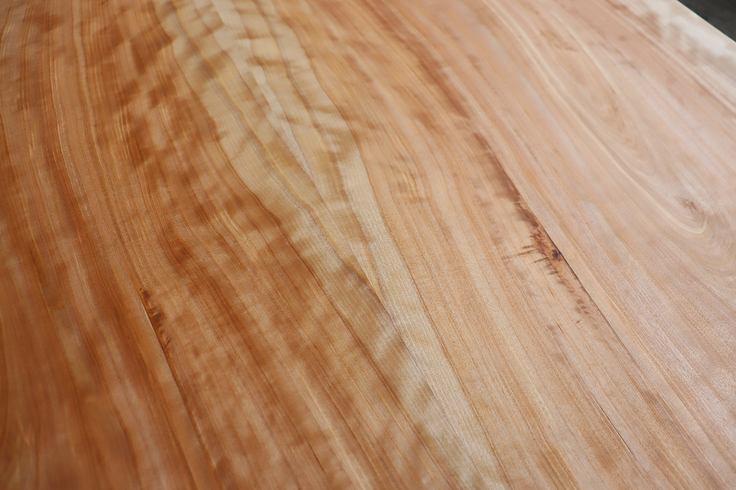 日の光で焼けた荒板の時点でもハッキリと確認できた縮杢は、表面をプレーナーで削り、丁寧に仕上げる事でその輝きはさらに輝きを増し、何年経ってもその輝きが失われることのない極上杢。