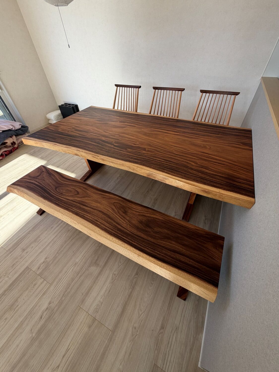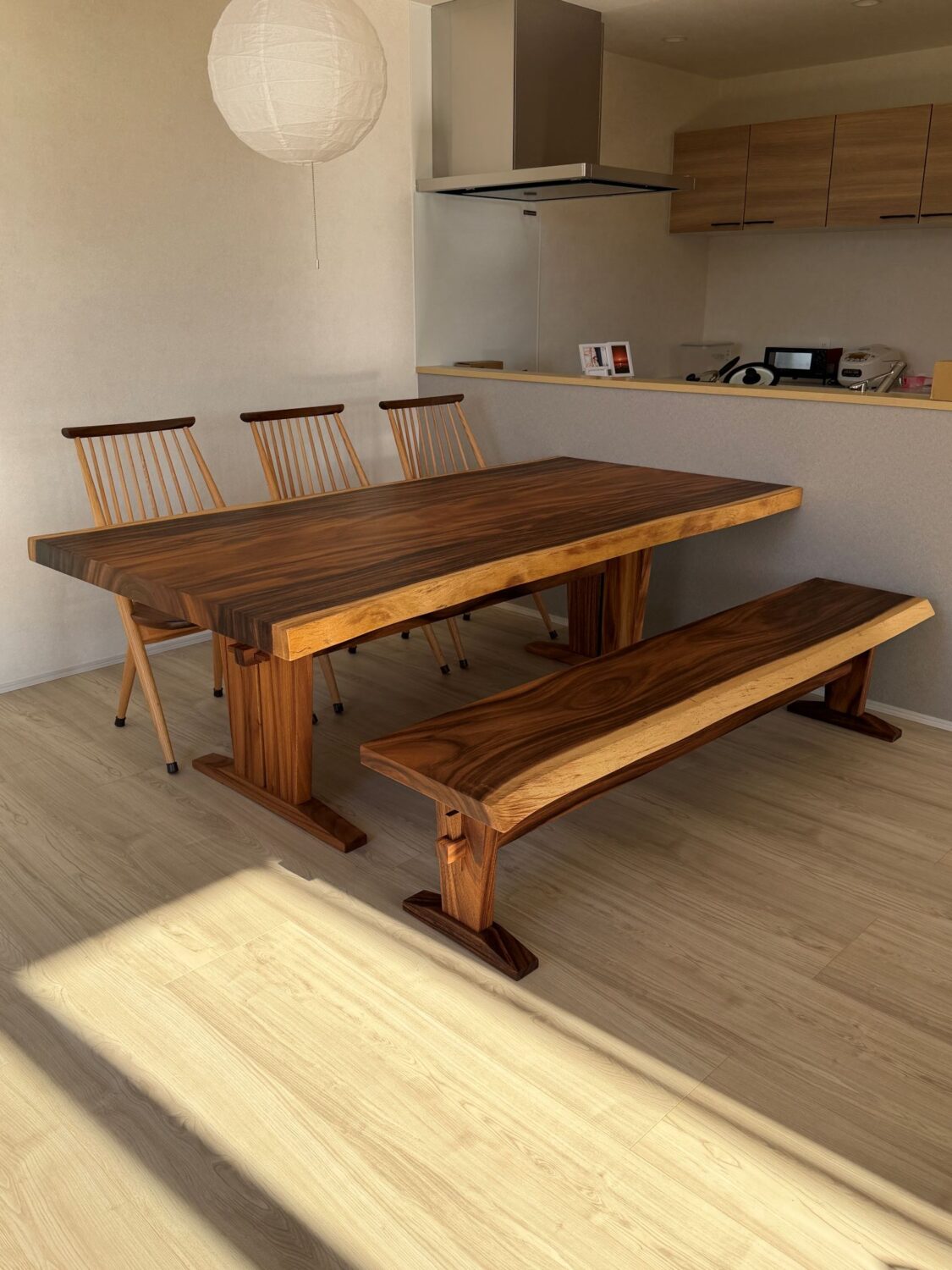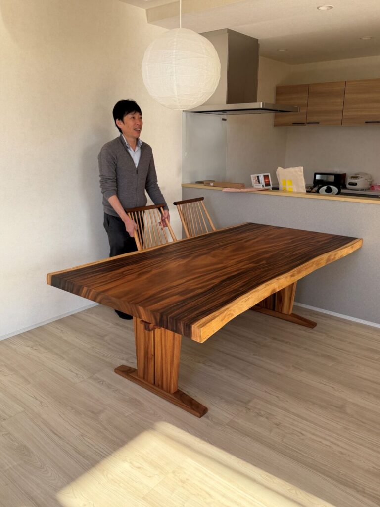 今回ご夫婦の新築住宅へ、モンキーポッド材の一枚板のダイニングテーブルとベンチをお届けいたしました。