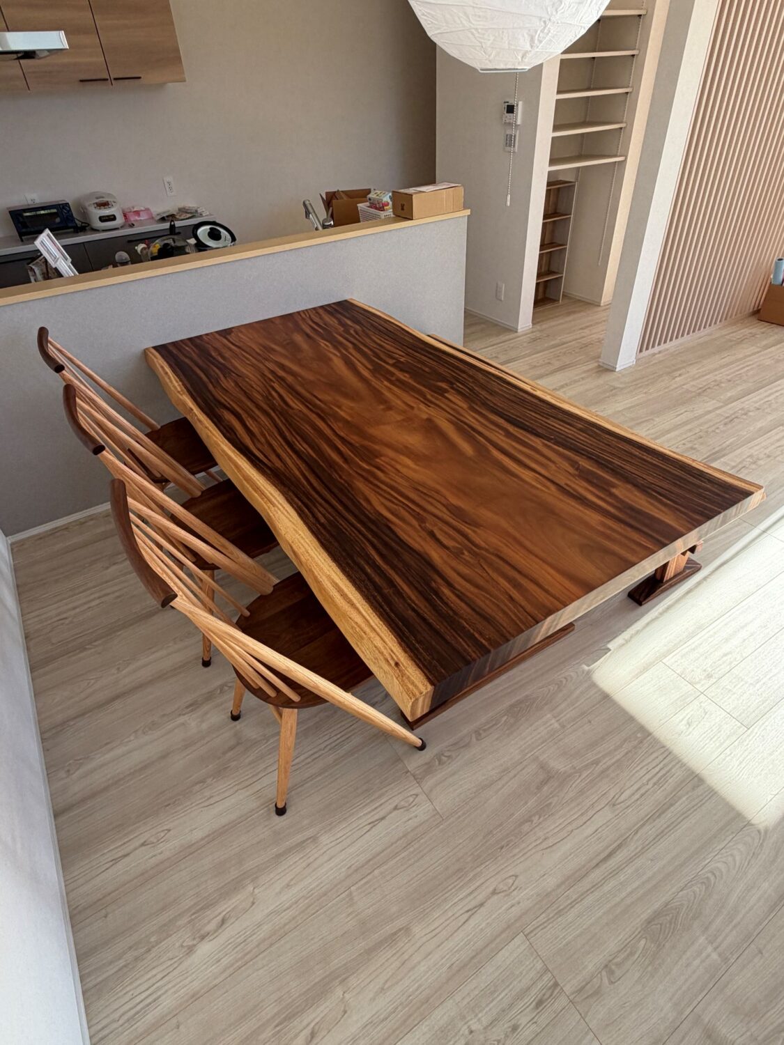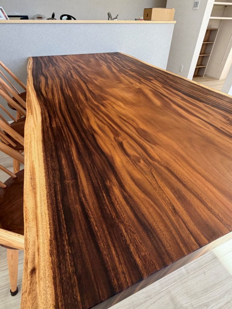 数ある一枚板の中から「これだ!」とお選びいただいたのが、この存在感あふれるモンキーポッド材。お届けの際に、実際にご自宅に設置した瞬間のお客様の嬉しそうな表情がとても印象的でした。