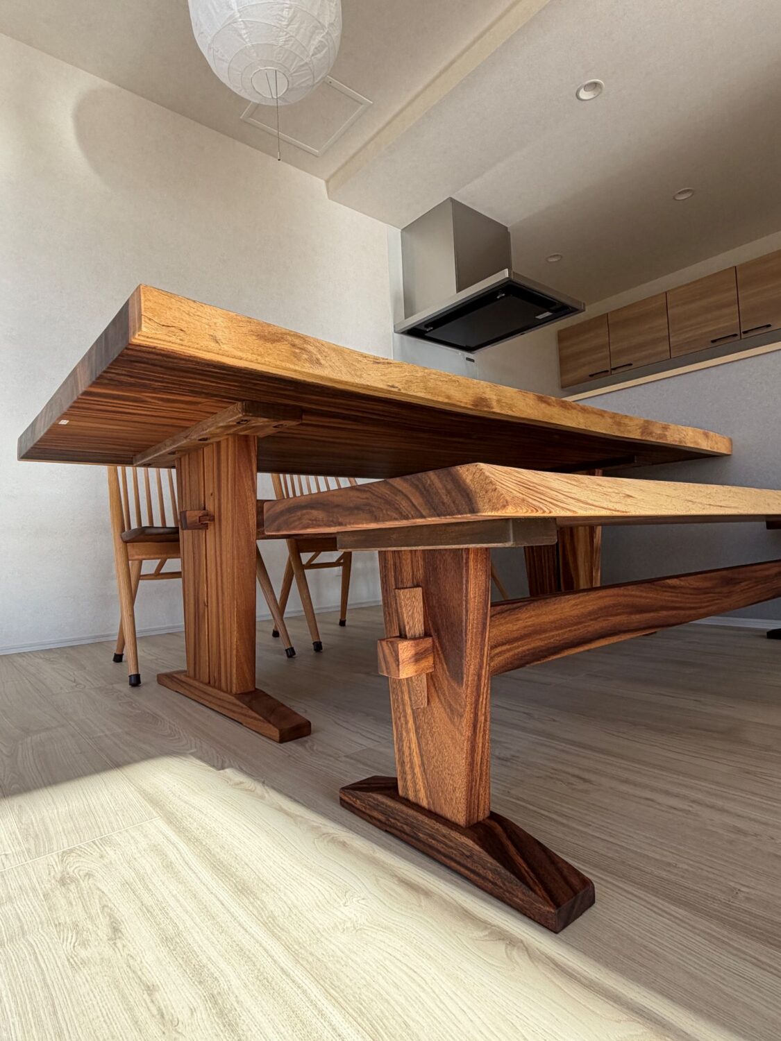 テーブルの長さに合わせて製作したベンチも同材のモンキーポッド材を使用し、一体感のある仕上がり。