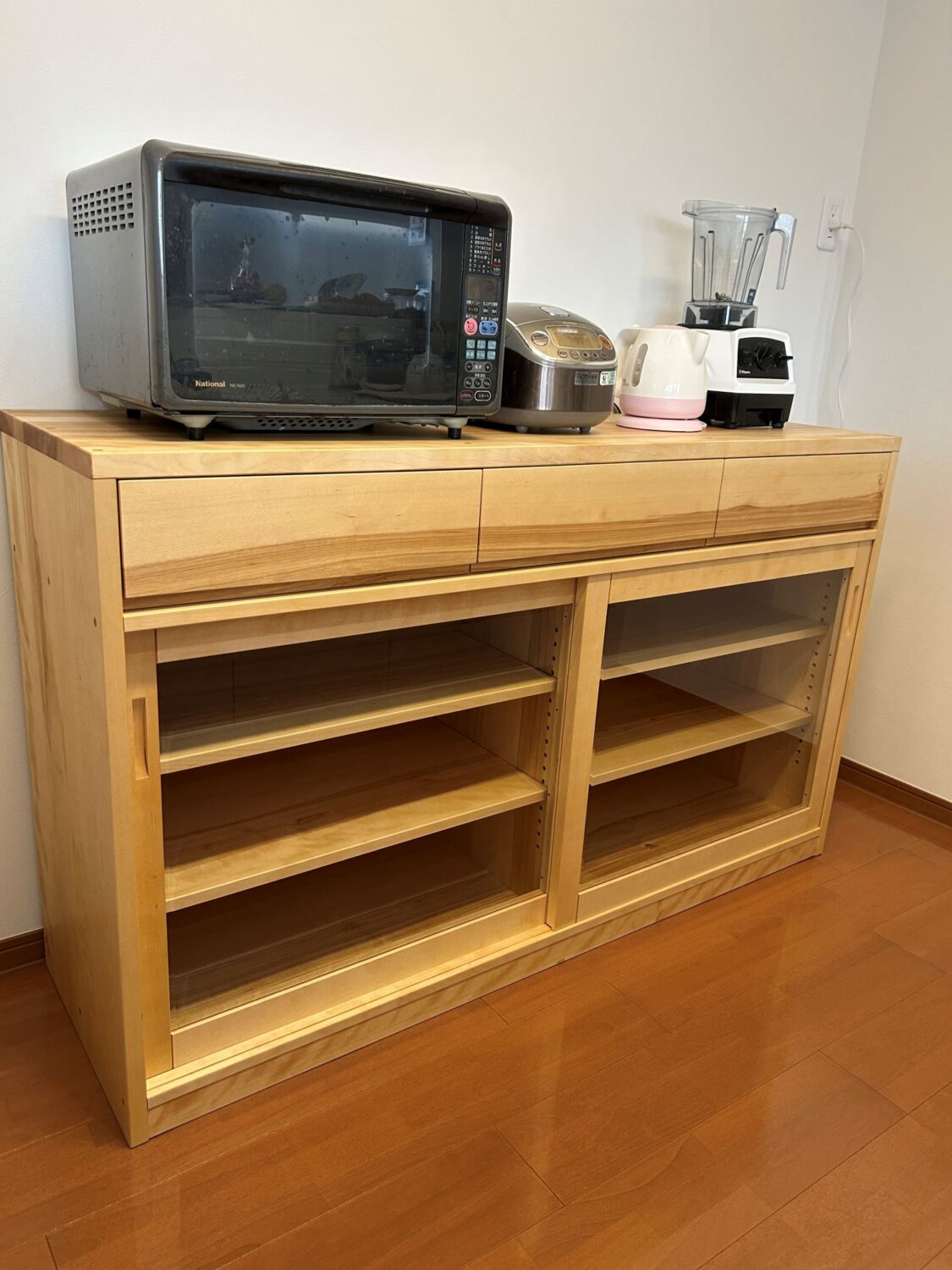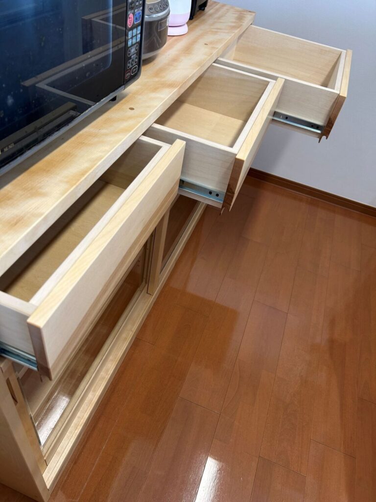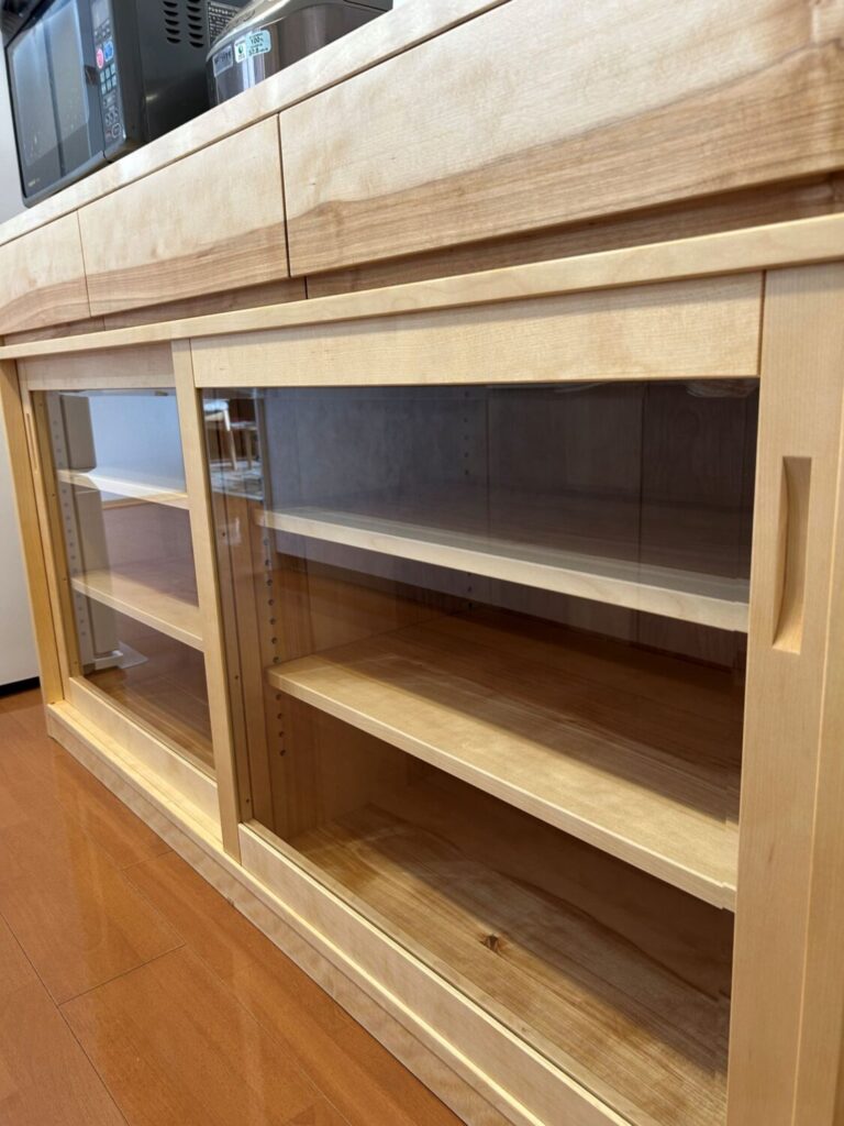 そのご要望に合わせ、今回は“カバ桜(カバザクラ)”を使用した特注のキッチンカウンター収納を製作・納品させていただきました。